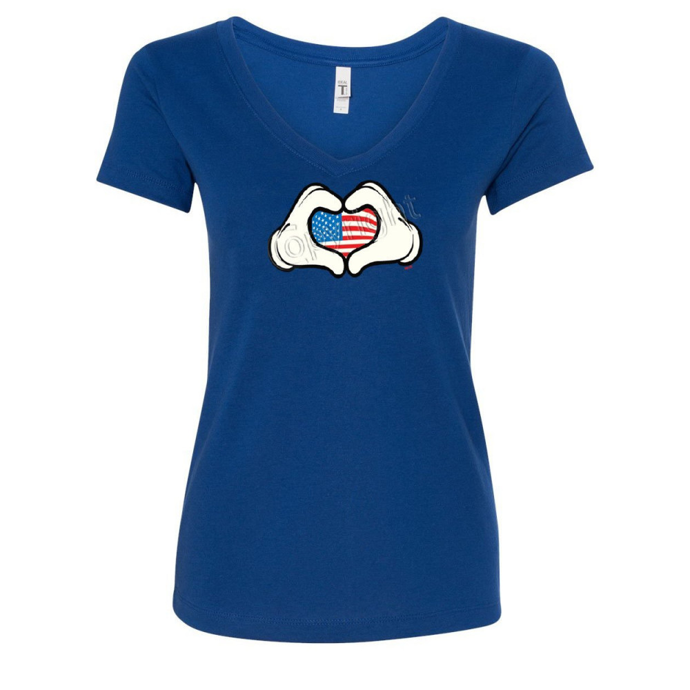 I HEART USA CARTOON HANDS women's v-neck t-shirt 4th of july cute american flag royal blue