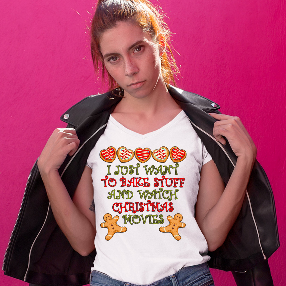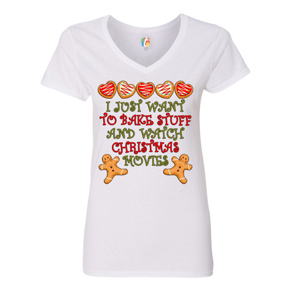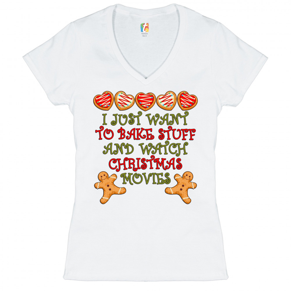 I JUST WANT TO BAKE STUFF AND WATCH CHRISTMAS MOVIES i just want to bake stuff women's v-neck t-shirt merry christmas funny tee white