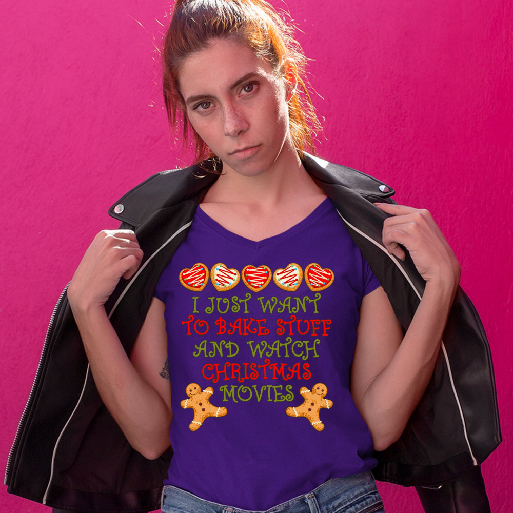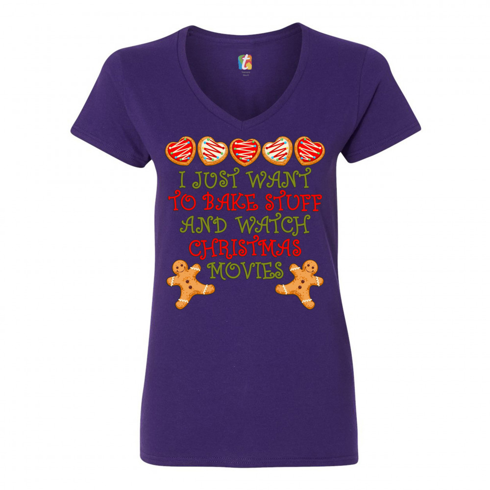 I JUST WANT TO BAKE STUFF AND WATCH CHRISTMAS MOVIES i just want to bake stuff women's v-neck t-shirt merry christmas funny tee purple