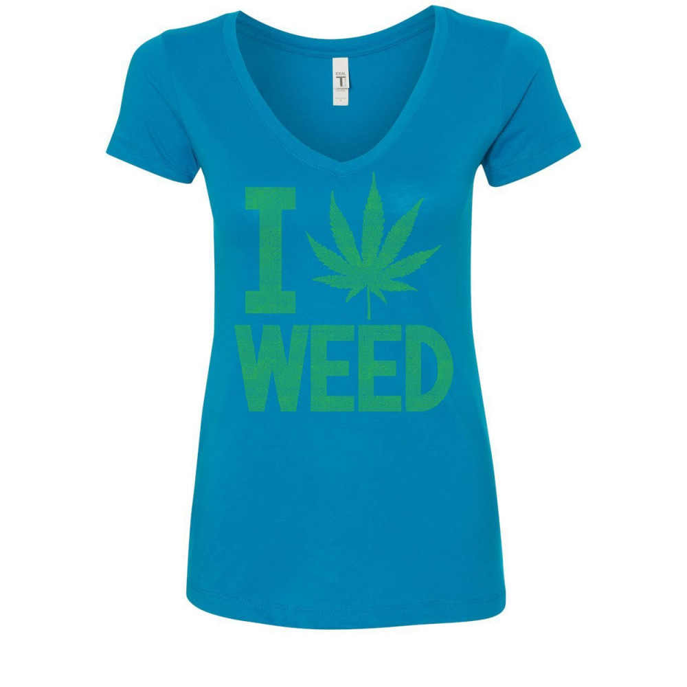 I LOVE WEED women's v-neck t-shirt smoking 420 pot reggae rasta marijuana kush turquoise