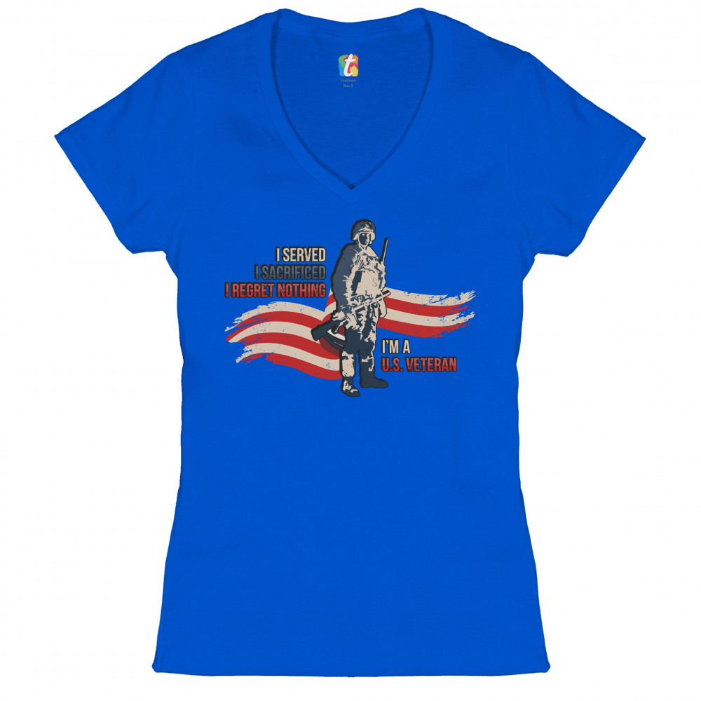 A patriotic print featuring a red-and-white stripe in the background and a soldier holding a rifle. The print says: "I Served I Sacrificed I Regreat Nothing I'm a U.S. Veteran". Great choice to wear on Independence Day or any other patriotic holiday.