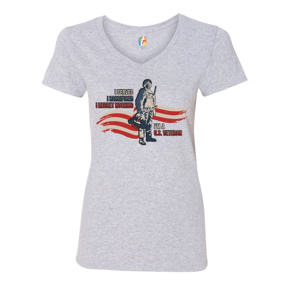 A patriotic print featuring a red-and-white stripe in the background and a soldier holding a rifle. The print says: "I Served I Sacrificed I Regreat Nothing I'm a U.S. Veteran". Great choice to wear on Independence Day or any other patriotic holiday.