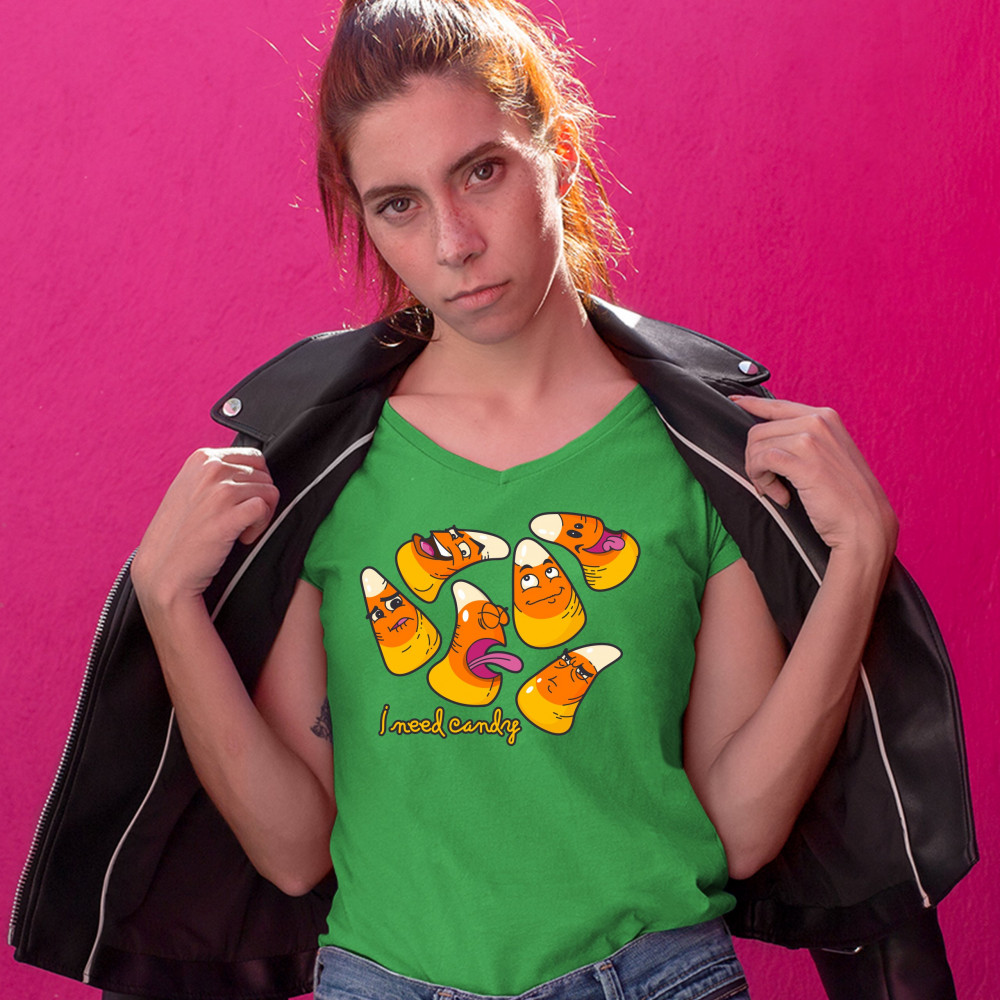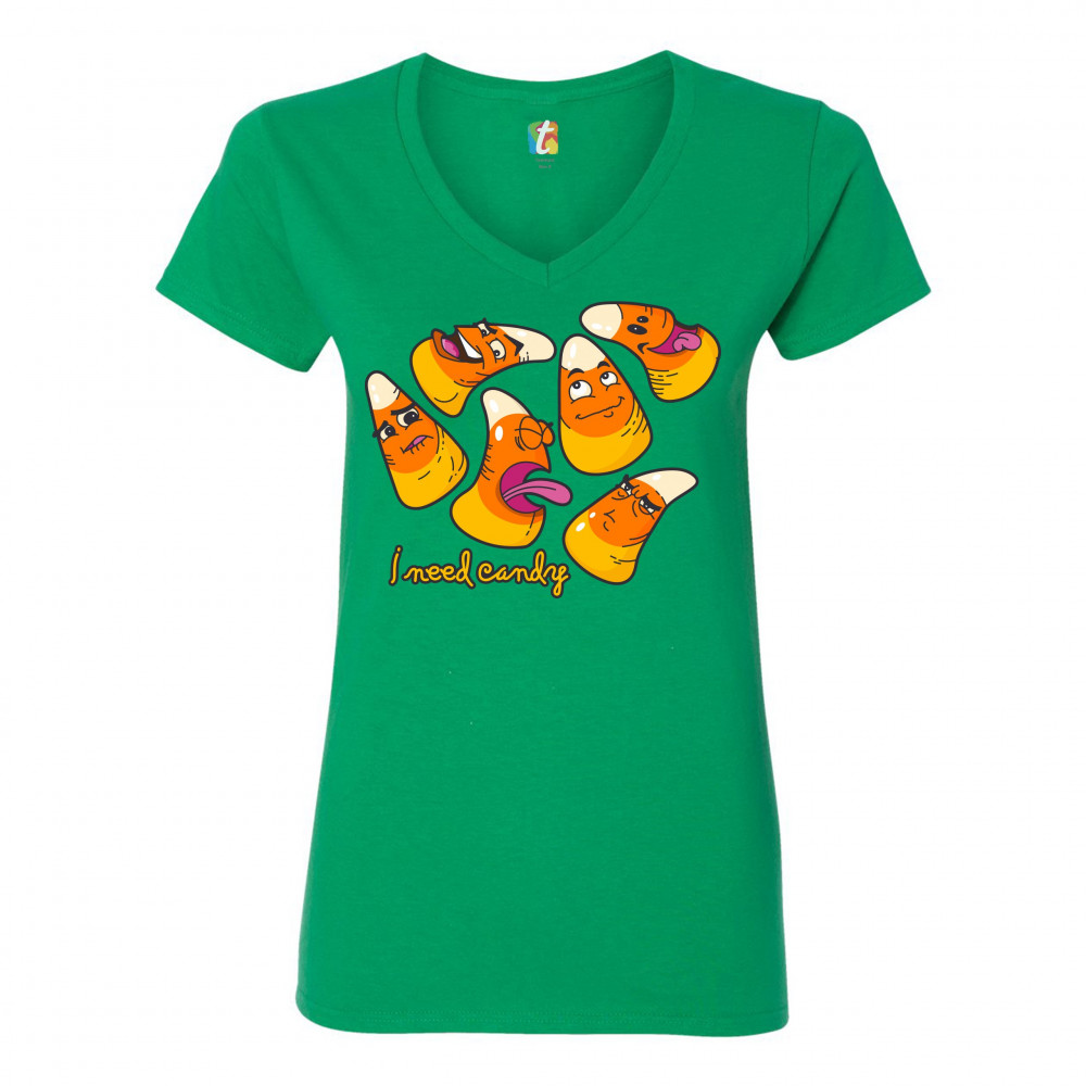 I NEED CANDY women's v-neck t-shirt happy halloween trick-or-treating tee green