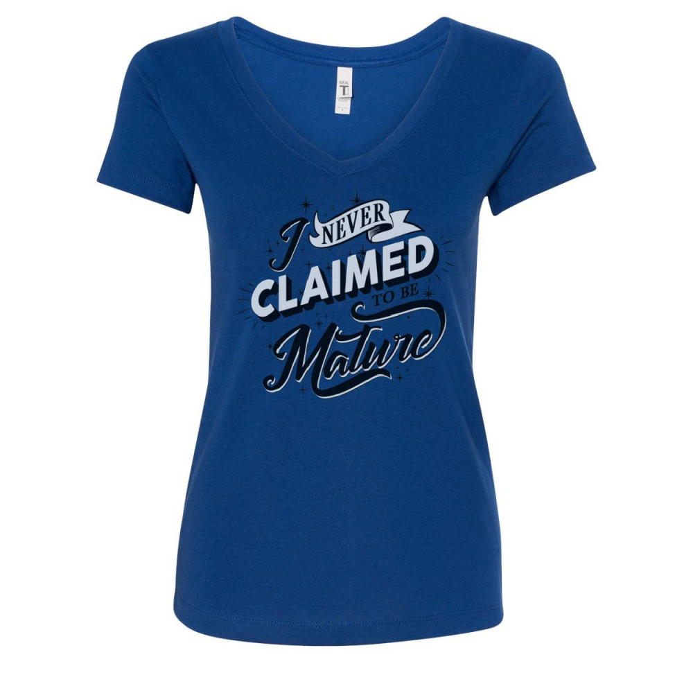 I NEVER CLAIMED TO BE MATURE women's v-neck t-shirt funny sarcastic college royal blue