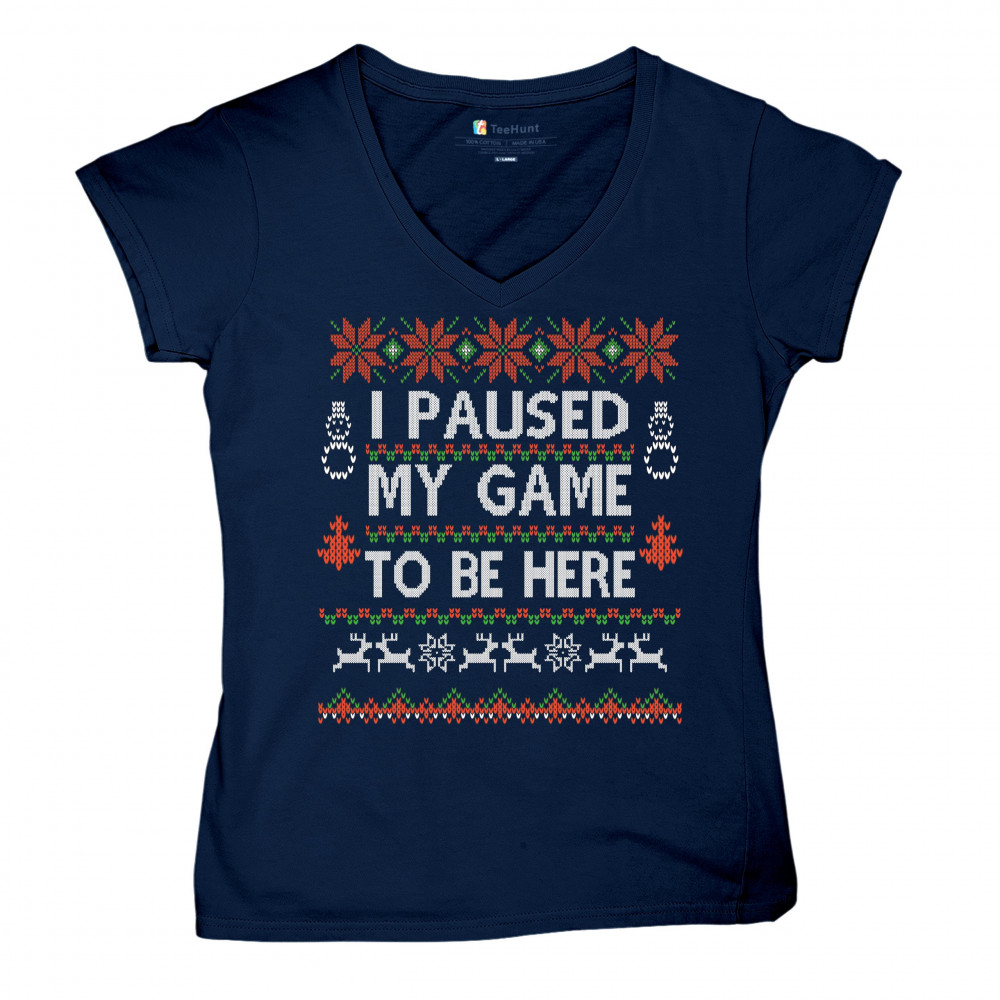 I PAUSED MY GAME TO BE HERE UGLY SWEATER THEME i paused my game to be here ugly sweater women's v-neck t-shirt christmas tee navy blue