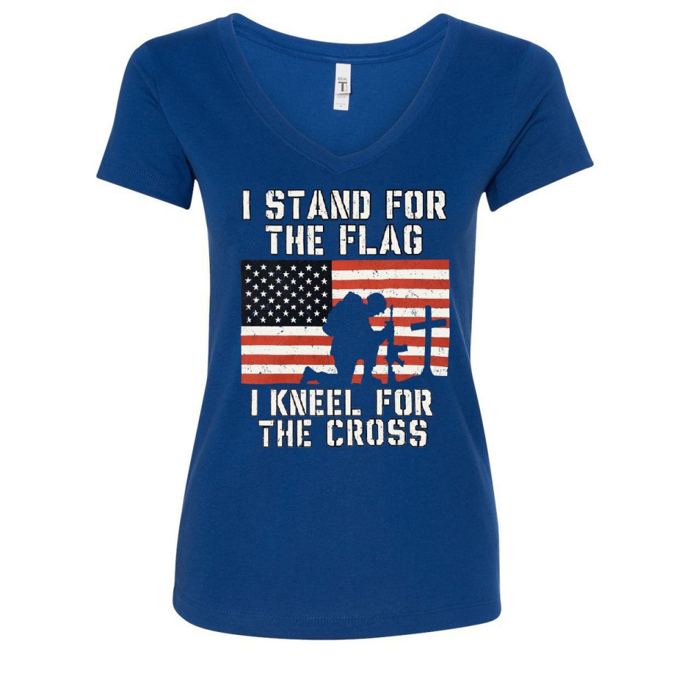 I STAND FOR THE FLAG I KNEEL FOR THE CROSS women's v-neck tee patriot military royal blue