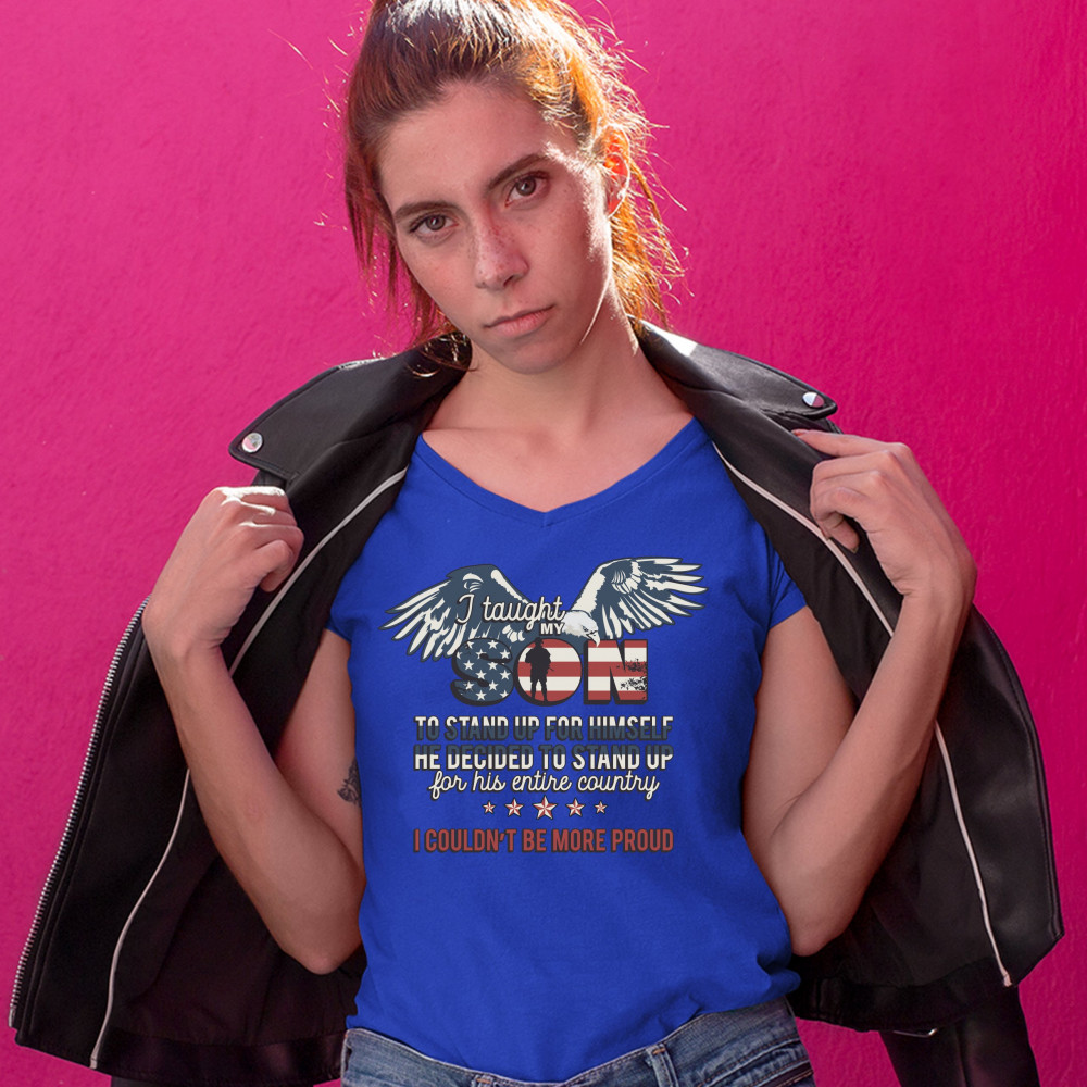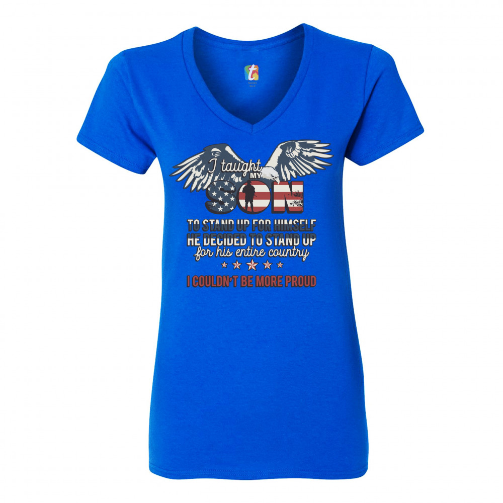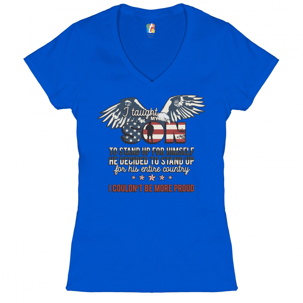 I TAUGHT MY SON TO STAND UP FOR HIMSELF women's v-neck t-shirt military tee royal blue