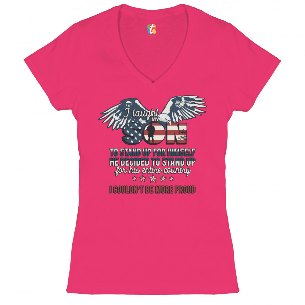 A patriotic print saying: "I Taught My Son to Stand up for Himself, He Decided to Stand Up for His Entire Country, I Couldn't Be More Proud". The print features a bald eagle, several stars and a small silhouette of a soldier inside of a letter "O" in "Son