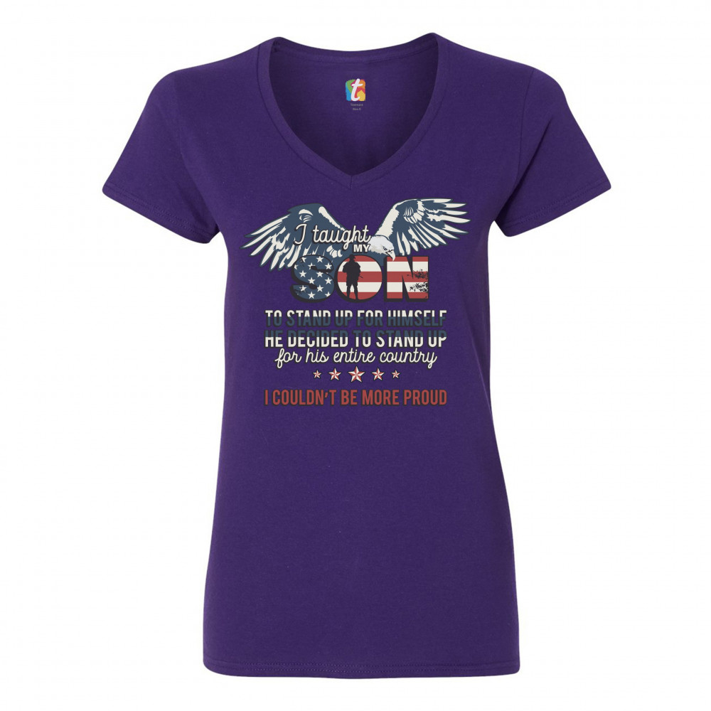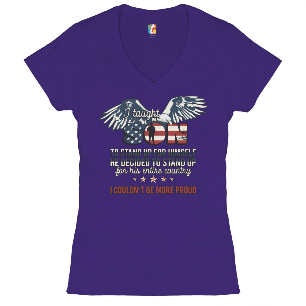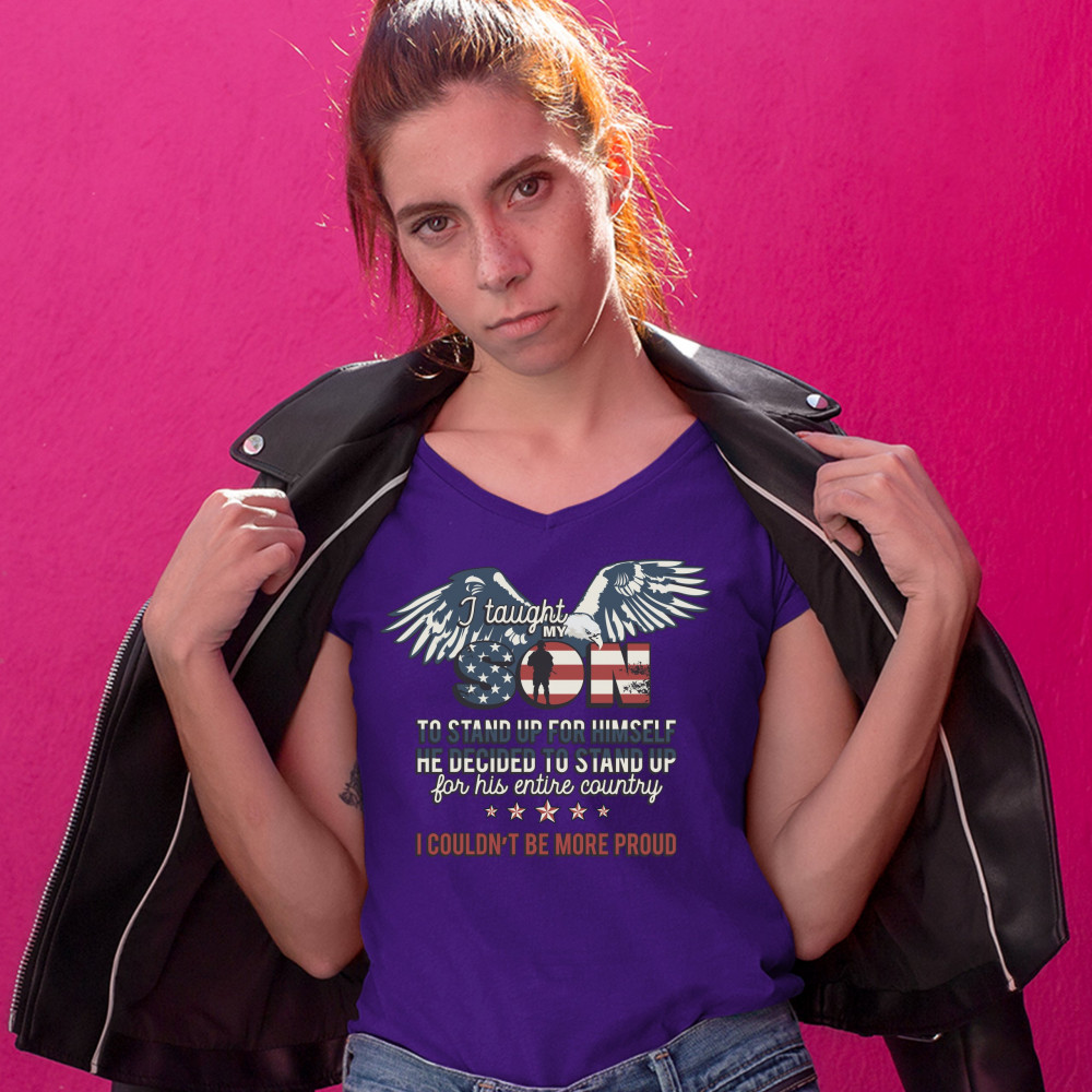 A patriotic print saying: "I Taught My Son to Stand up for Himself, He Decided to Stand Up for His Entire Country, I Couldn't Be More Proud". The print features a bald eagle, several stars and a small silhouette of a soldier inside of a letter "O" in "Son