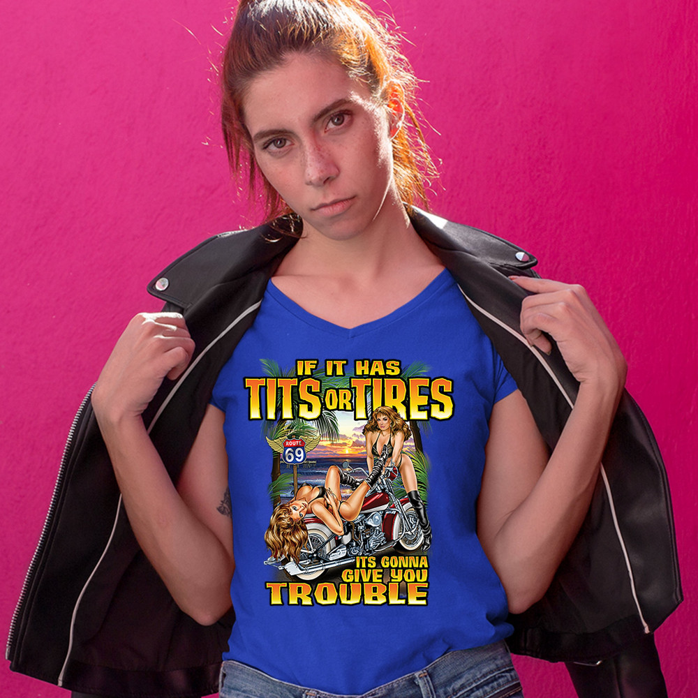 IF IT HAS TITS OR TIRES... women's v-neck t-shirt route 69 biker sexy babes tee royal blue