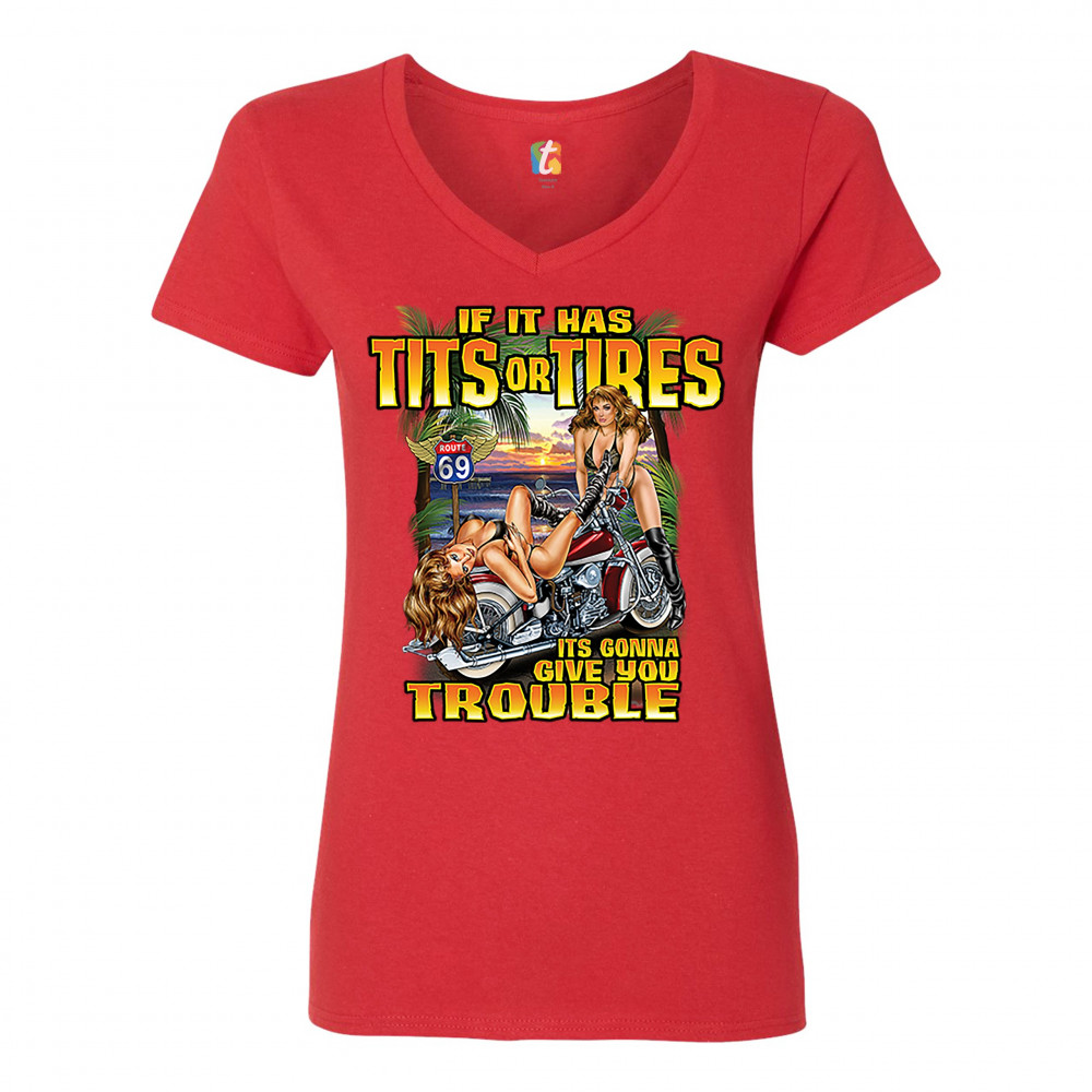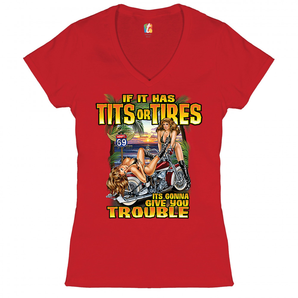 A print featuring two barely dressed sexy women leaning on a vintage motorcycle parked at the beach. There is a "Route 69" road sign in the background. The print says: "If it has tits or tires it's gonna give you trouble". A great choice for a motorcycle