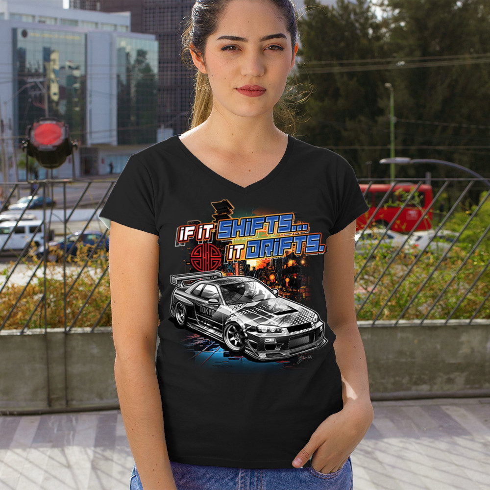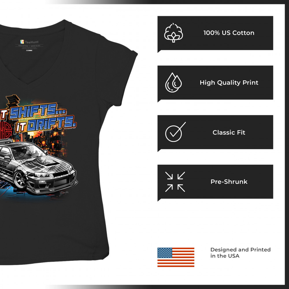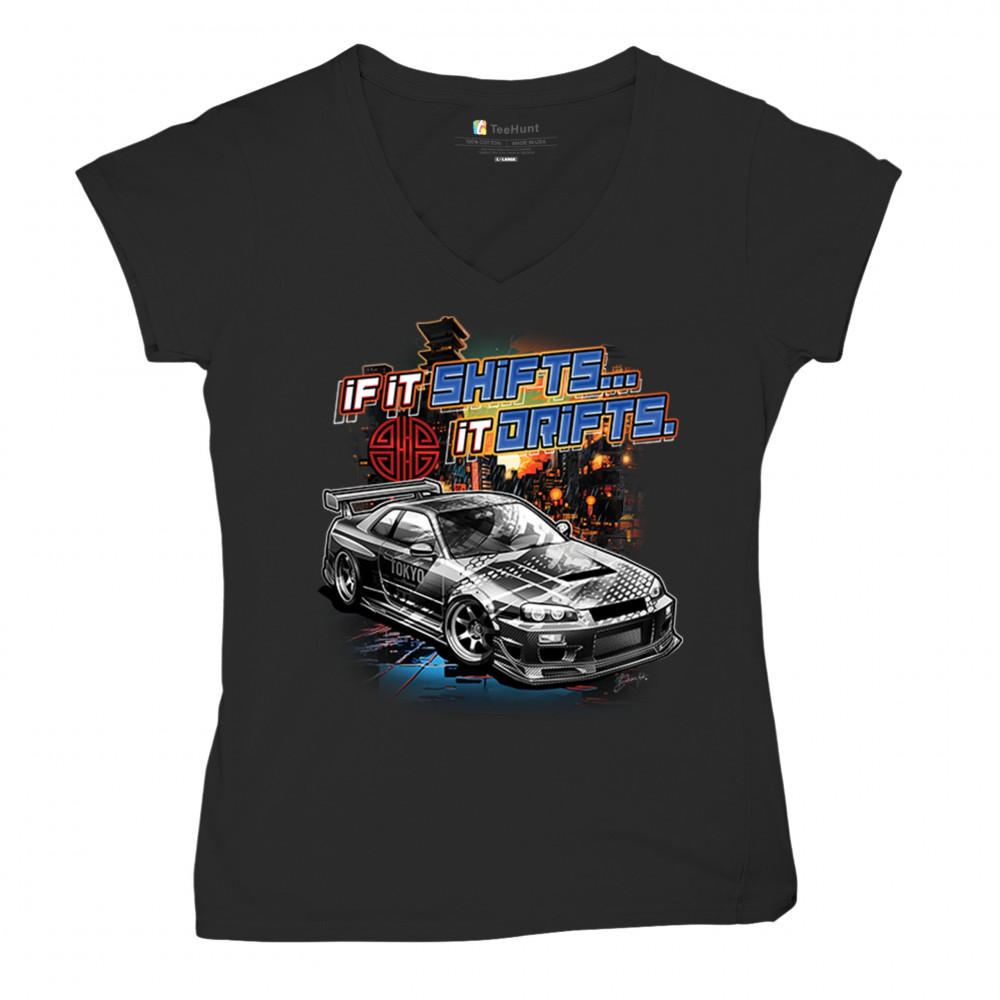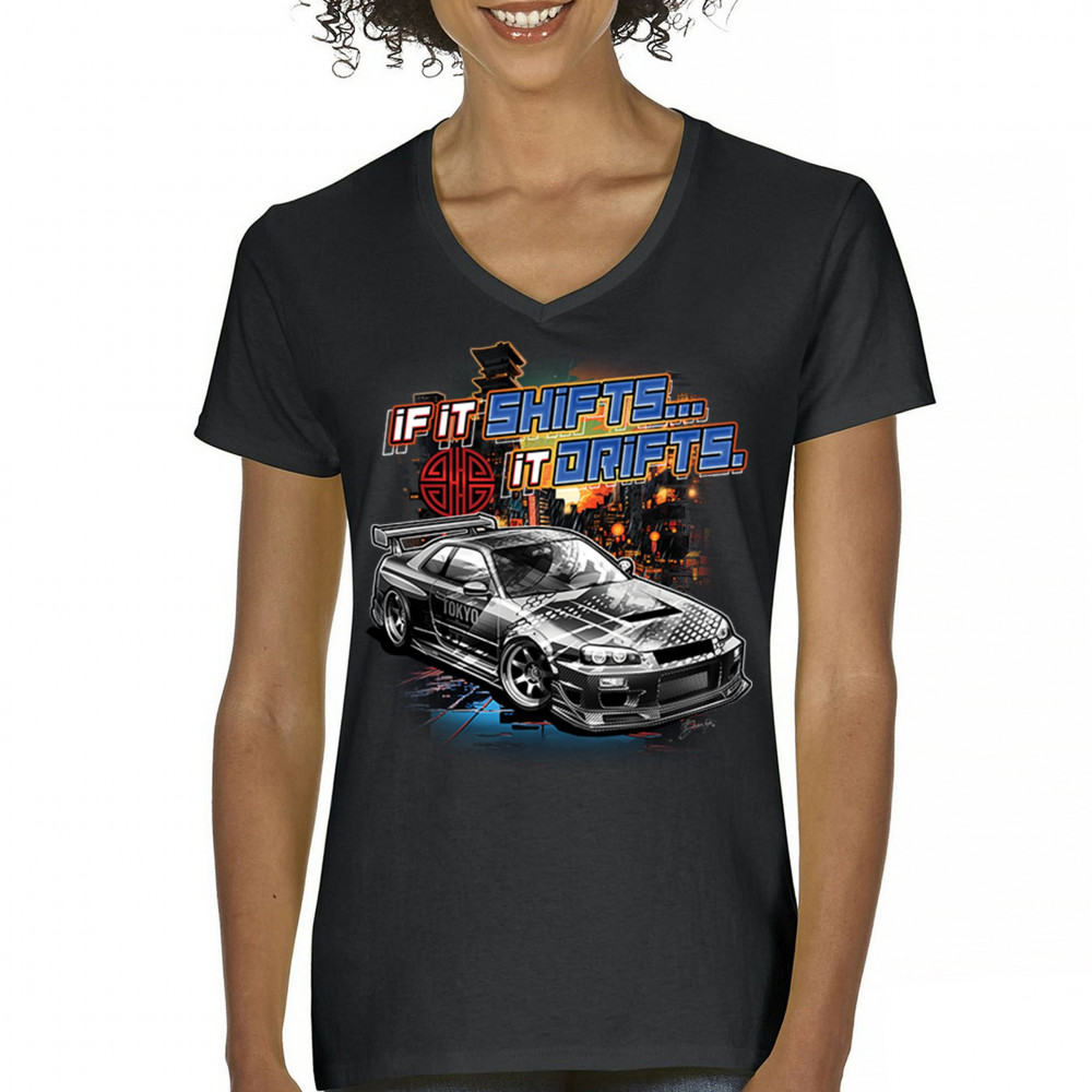 IF IT SHIFTS IT DRIFTS women's v-neck t-shirt racing custom japanese cars tee black
