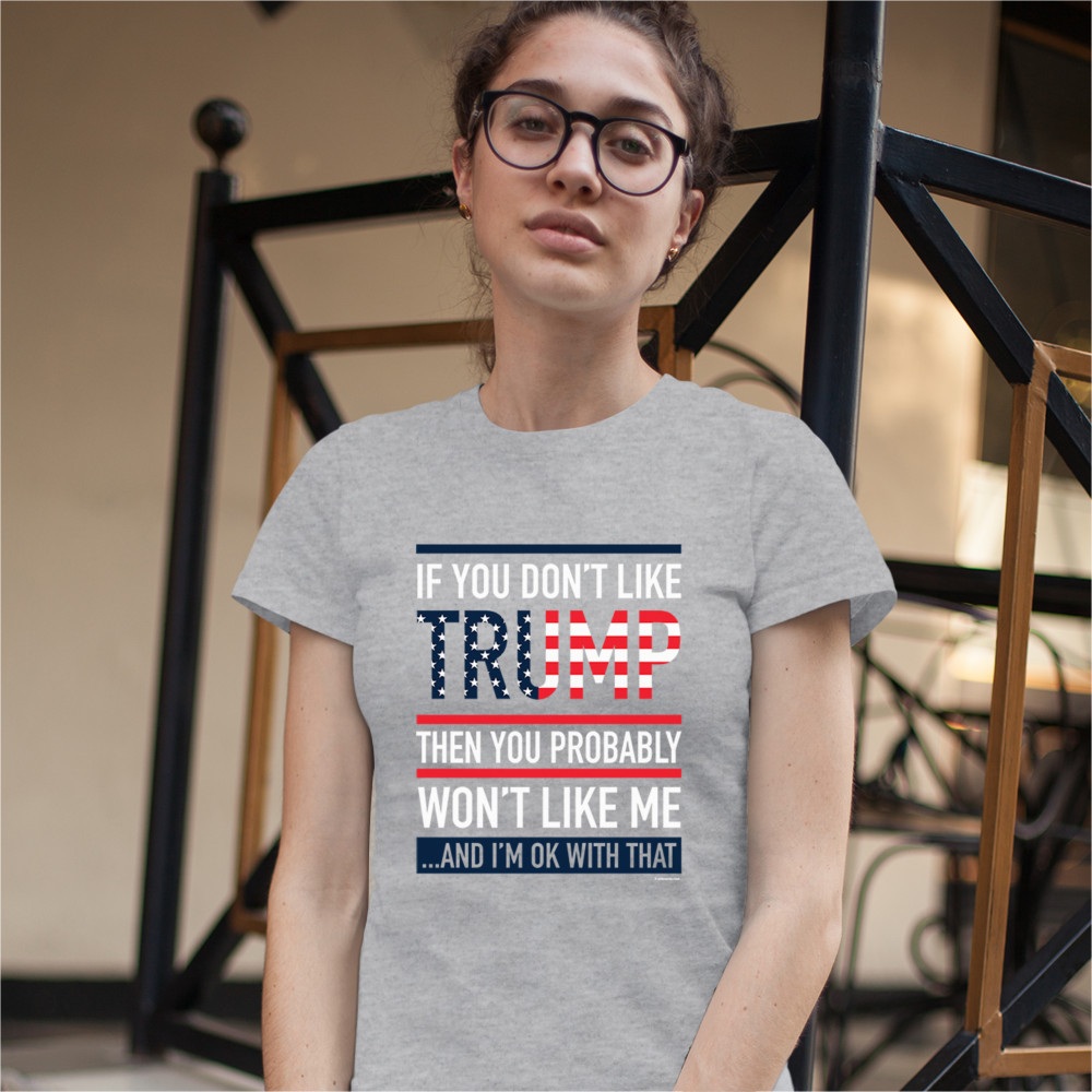 A political print saying "If You don't like Trump then you probably won't like me …and I'm ok with that". The word Trump is decorated with stars and stripes. A great choice to wear for a Trump rally or give as a gift to a Donald Trump and Mike Pence supporter before 2020 presidential elections.