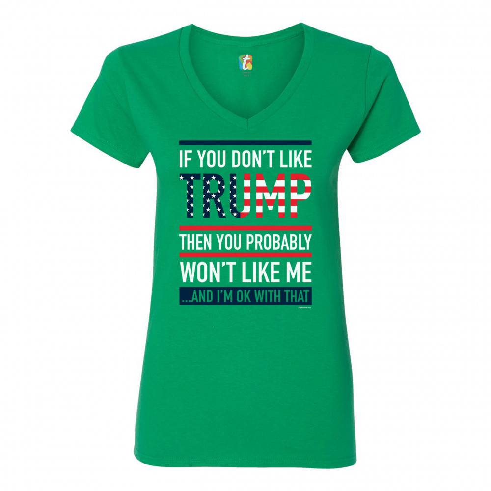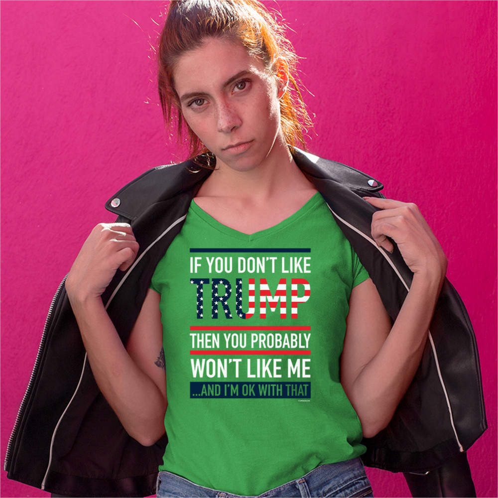 A political print saying "If You don't like Trump then you probably won't like me …and I'm ok with that". The word Trump is decorated with stars and stripes. A great choice to wear for a Trump rally or give as a gift to a Donald Trump and Mike Pence supporter before 2020 presidential elections.