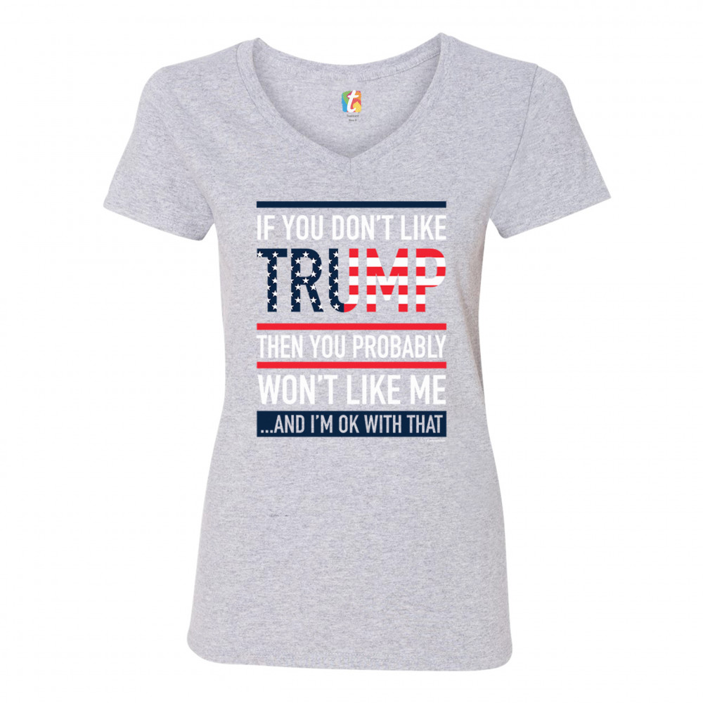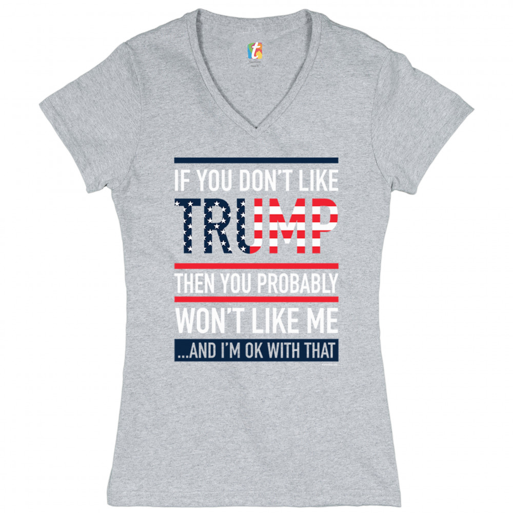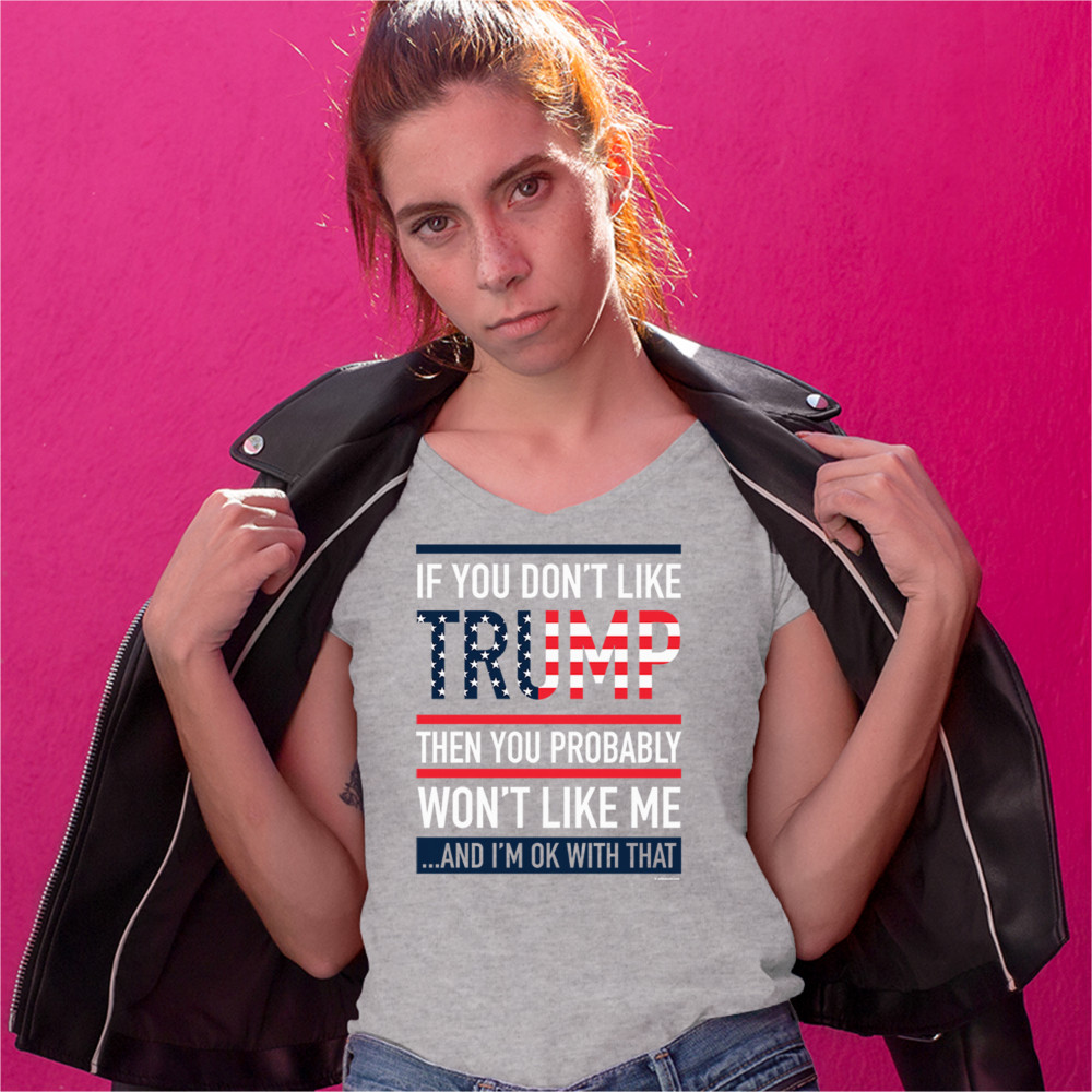 A political print saying "If You don't like Trump then you probably won't like me …and I'm ok with that". The word Trump is decorated with stars and stripes. A great choice to wear for a Trump rally or give as a gift to a Donald Trump and Mike Pence supporter before 2020 presidential elections.