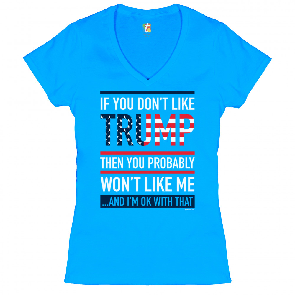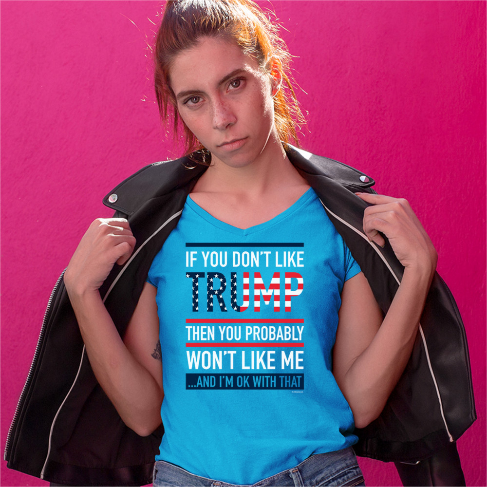 A political print saying "If You don't like Trump then you probably won't like me …and I'm ok with that". The word Trump is decorated with stars and stripes. A great choice to wear for a Trump rally or give as a gift to a Donald Trump and Mike Pence supporter before 2020 presidential elections.