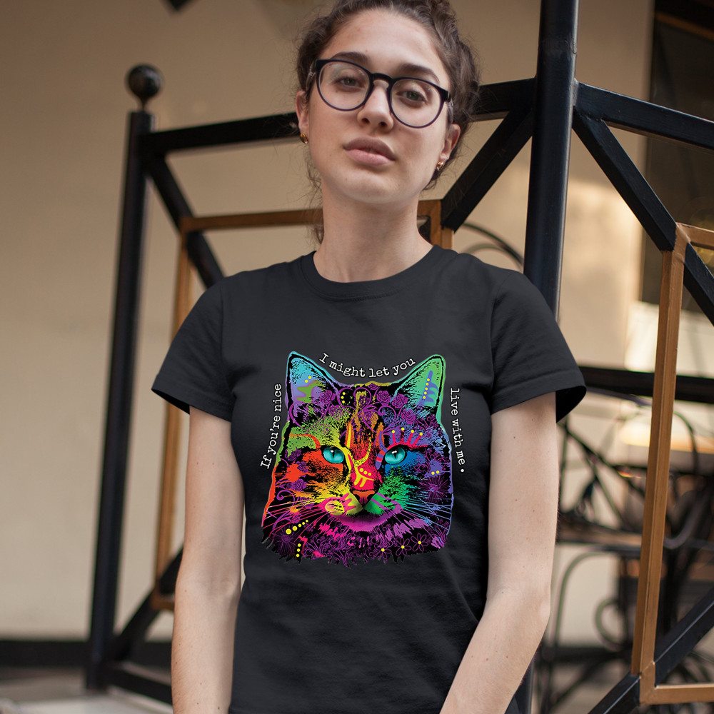 A print featuring a colorful neon face of a gorgeous cat. The print says: "If you're nice I might let you live with me". A great choice for any cat person.