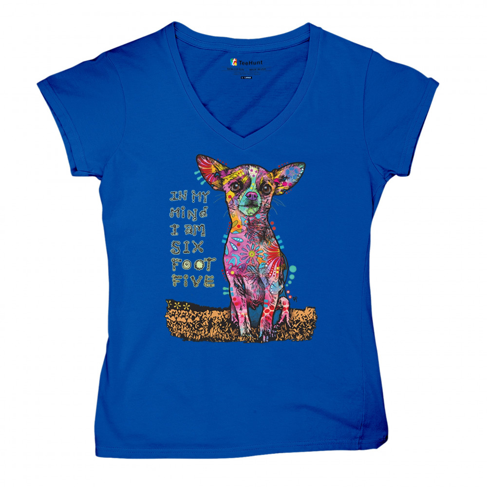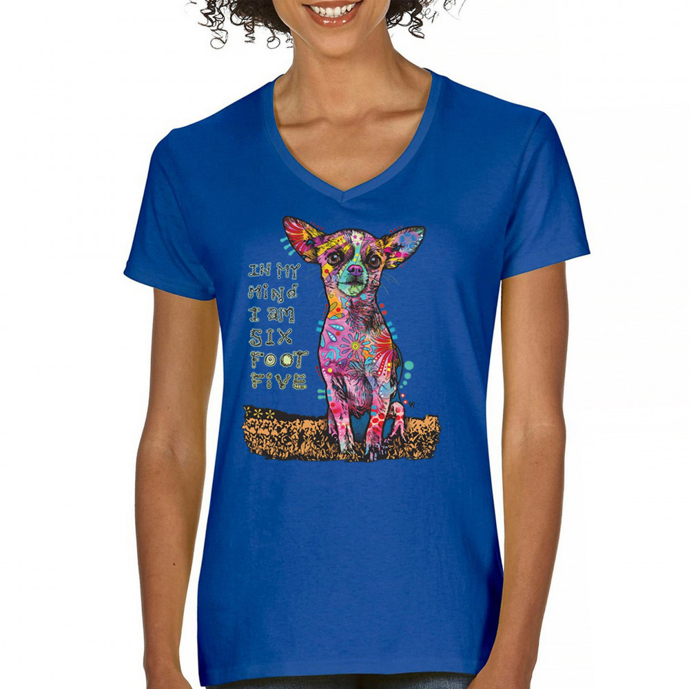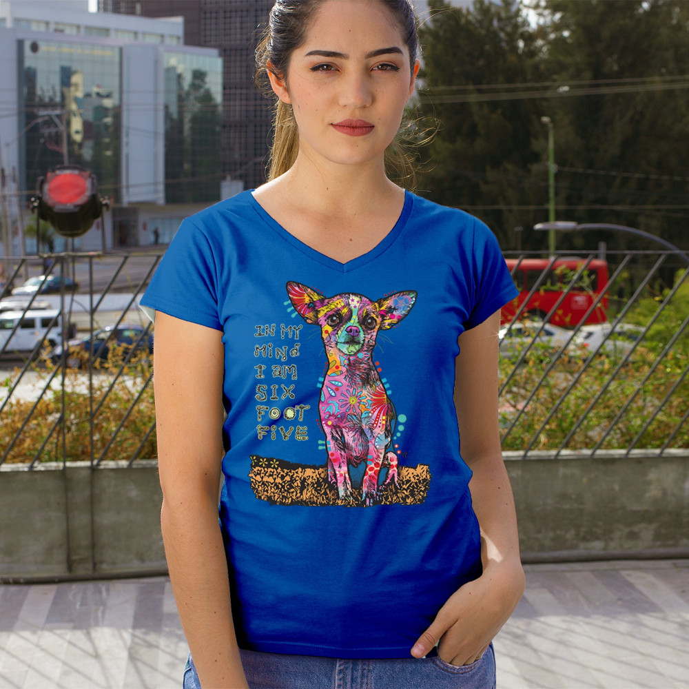 IN MY MIND I'M SIX FOOT FIVE women's v-neck t-shirt dean russo chihuahua tee royal blue