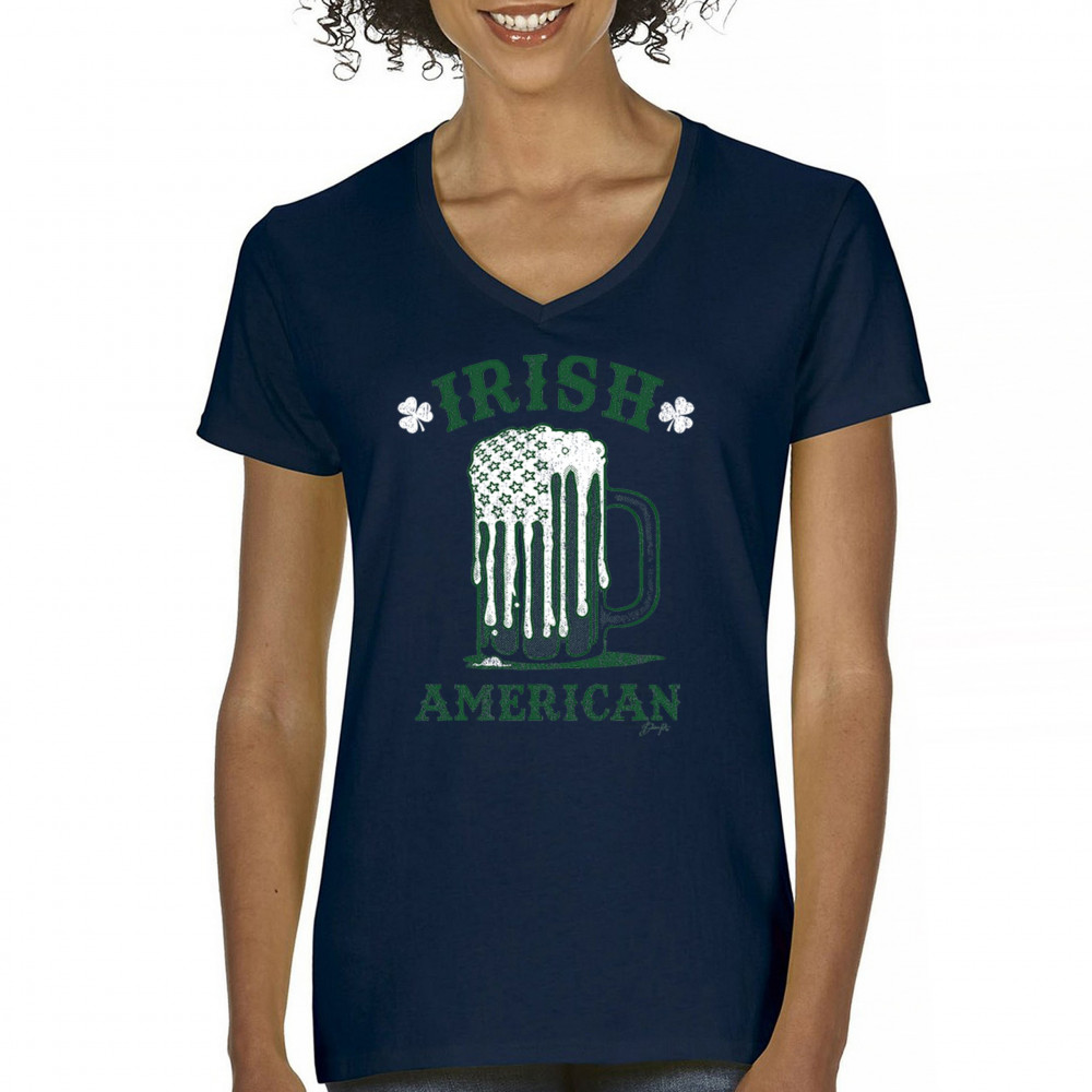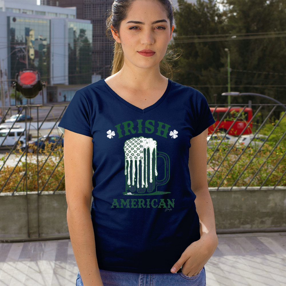 IRISH AMERICAN ST PATRICK'S DAY women's v-neck t-shirt shamrock beer mug tee navy blue