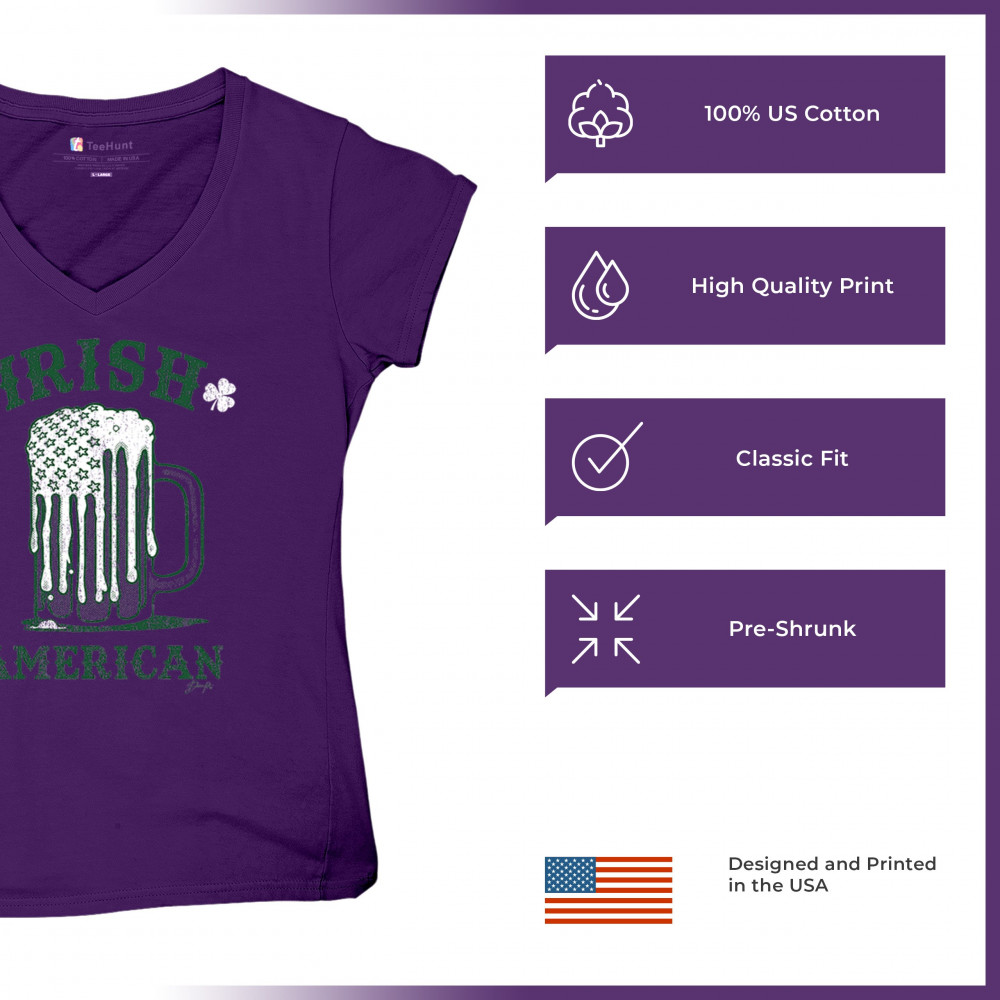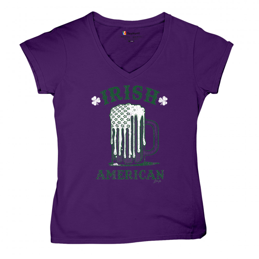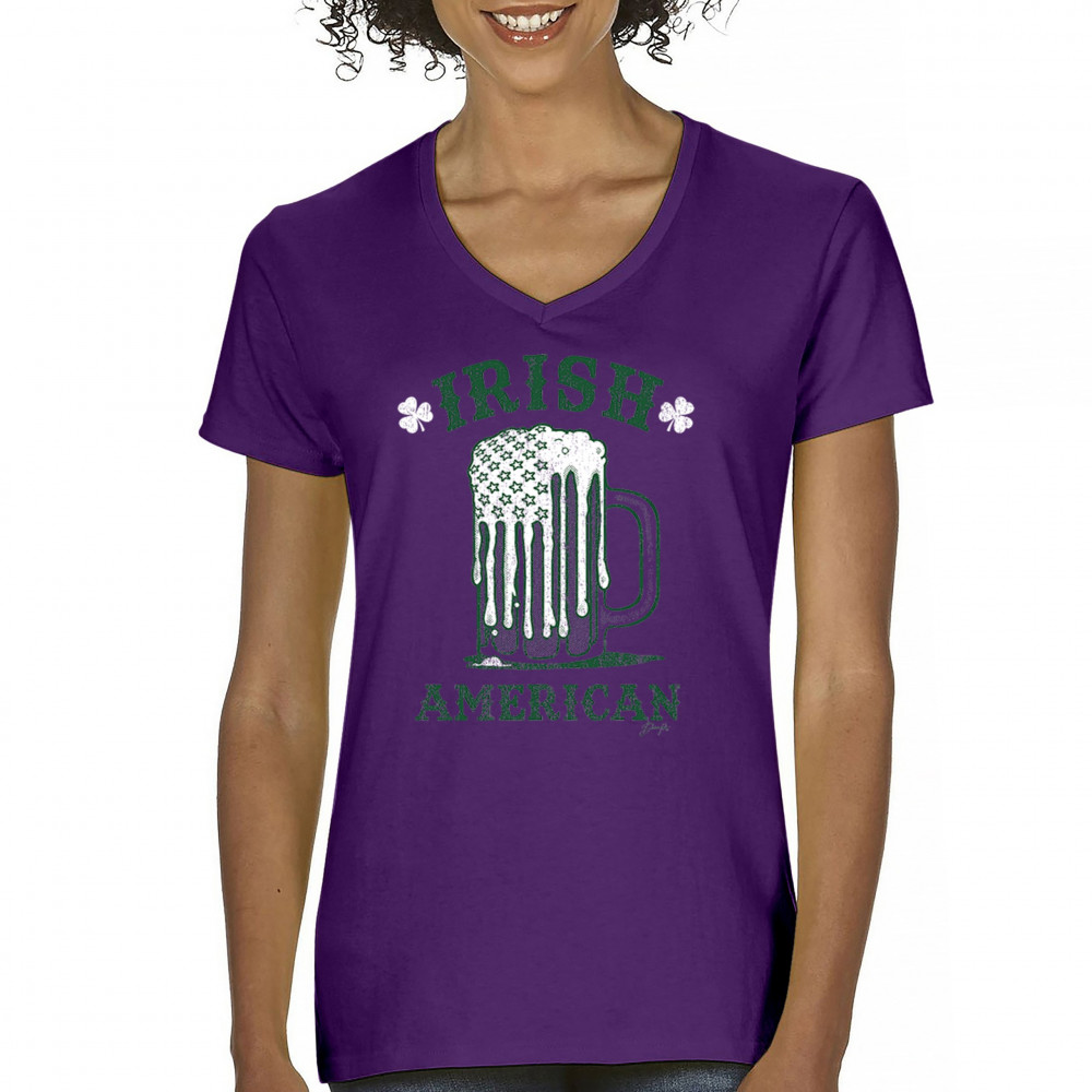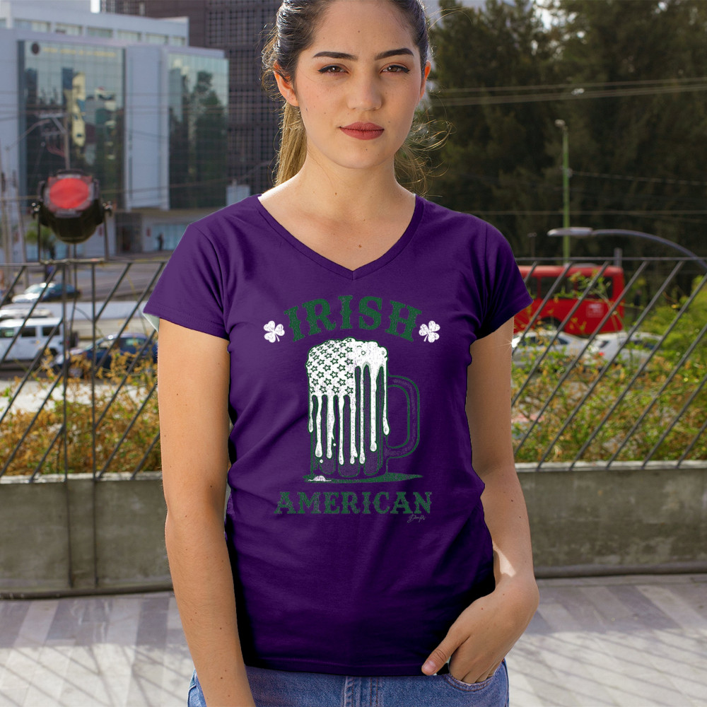 IRISH AMERICAN ST PATRICK'S DAY women's v-neck t-shirt shamrock beer mug tee purple