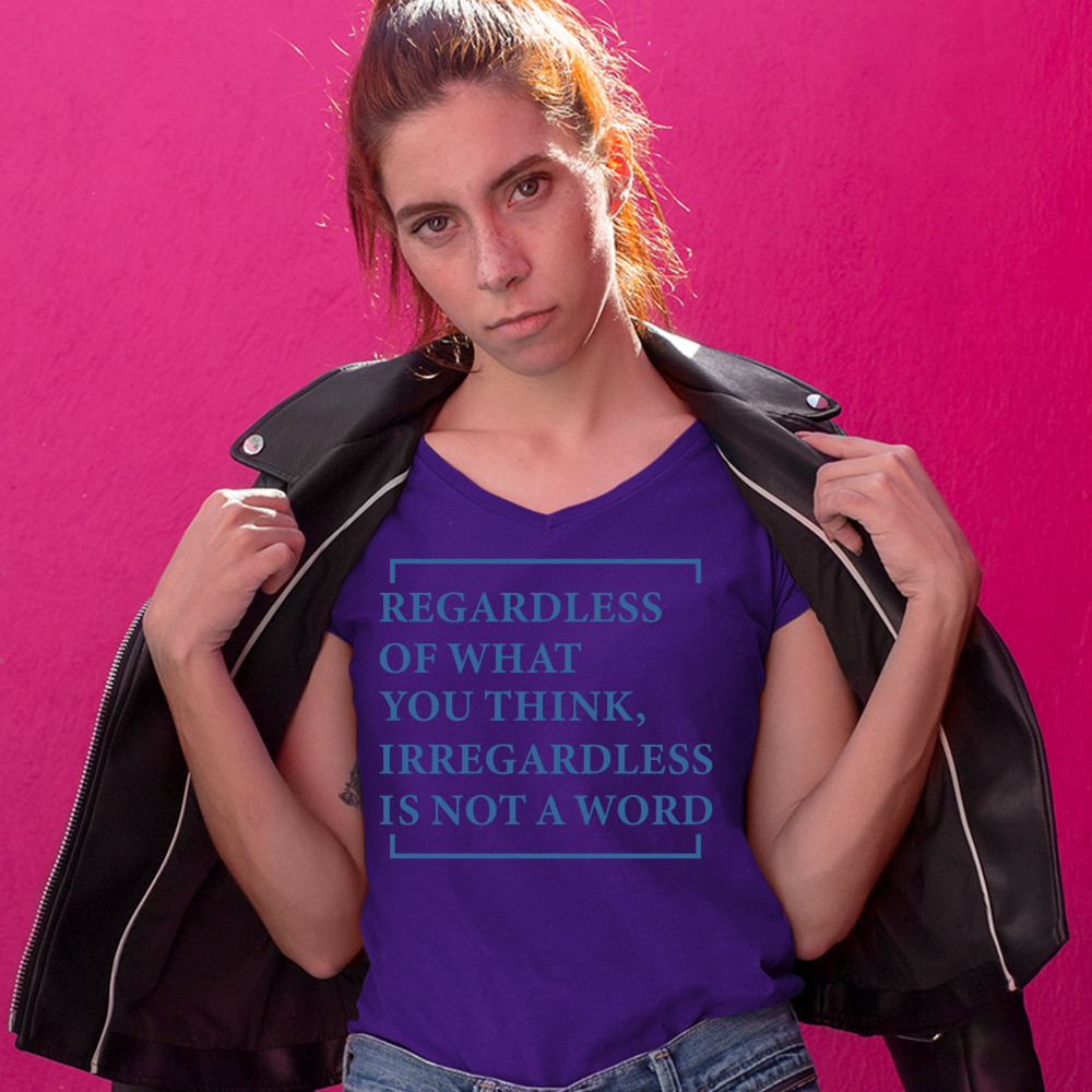 A funny print saying "regardless of what You think, irregardless is not a word". A great choice to wear to make people smile.