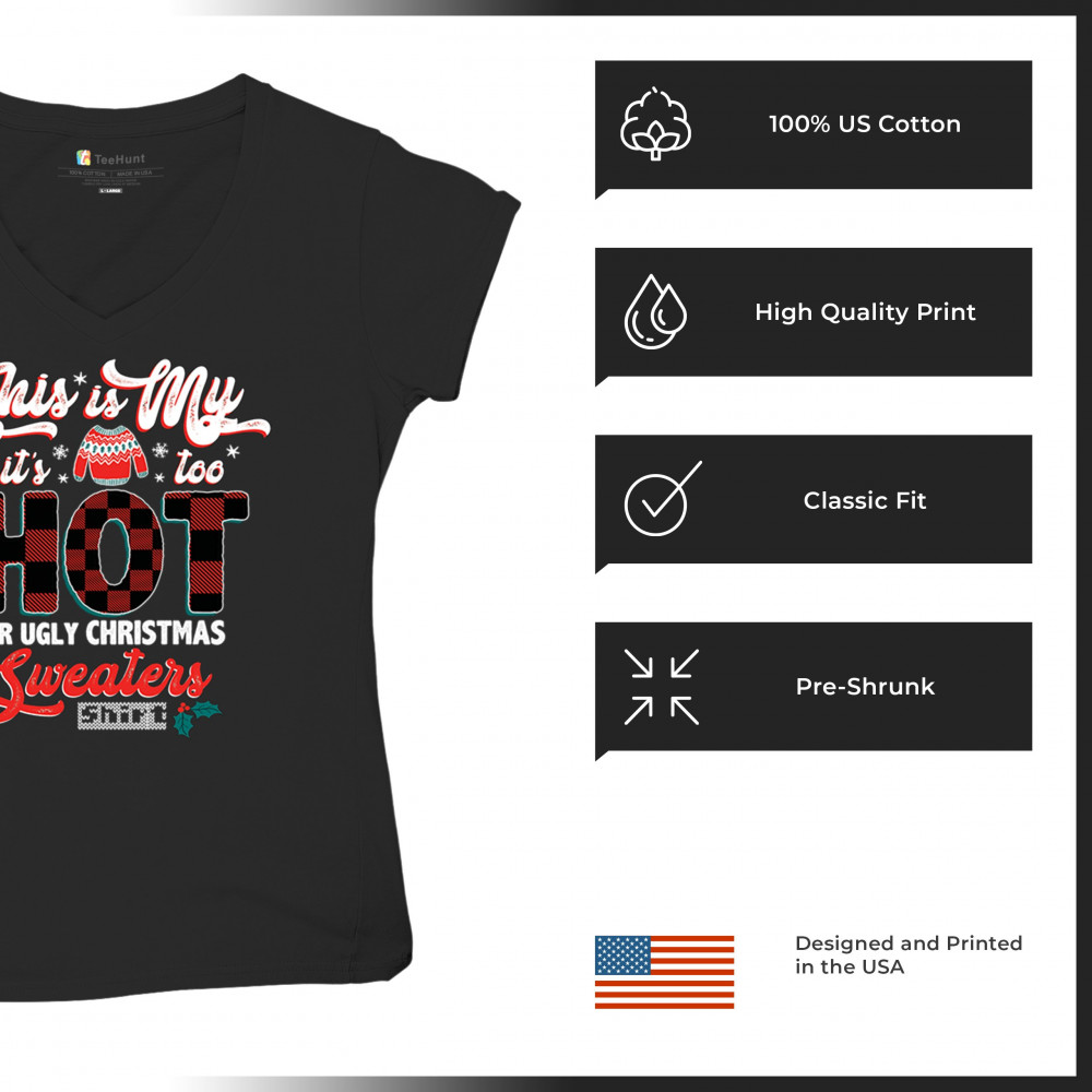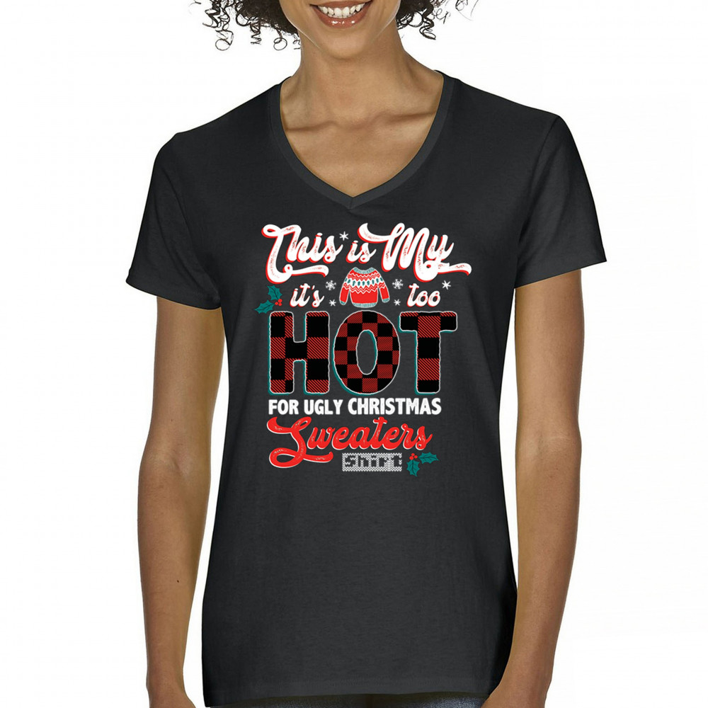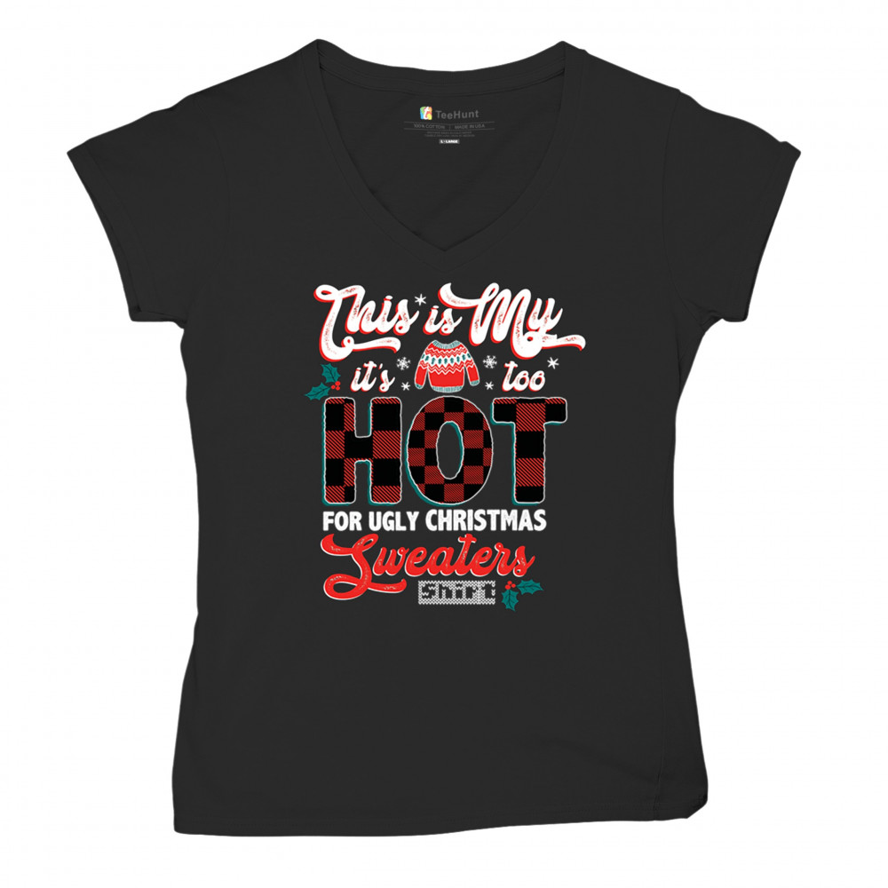 IT'S TOO HOT FOR UGLY CHRISTMAS SWEATERS women's v-neck t-shirt funny xmas tee black