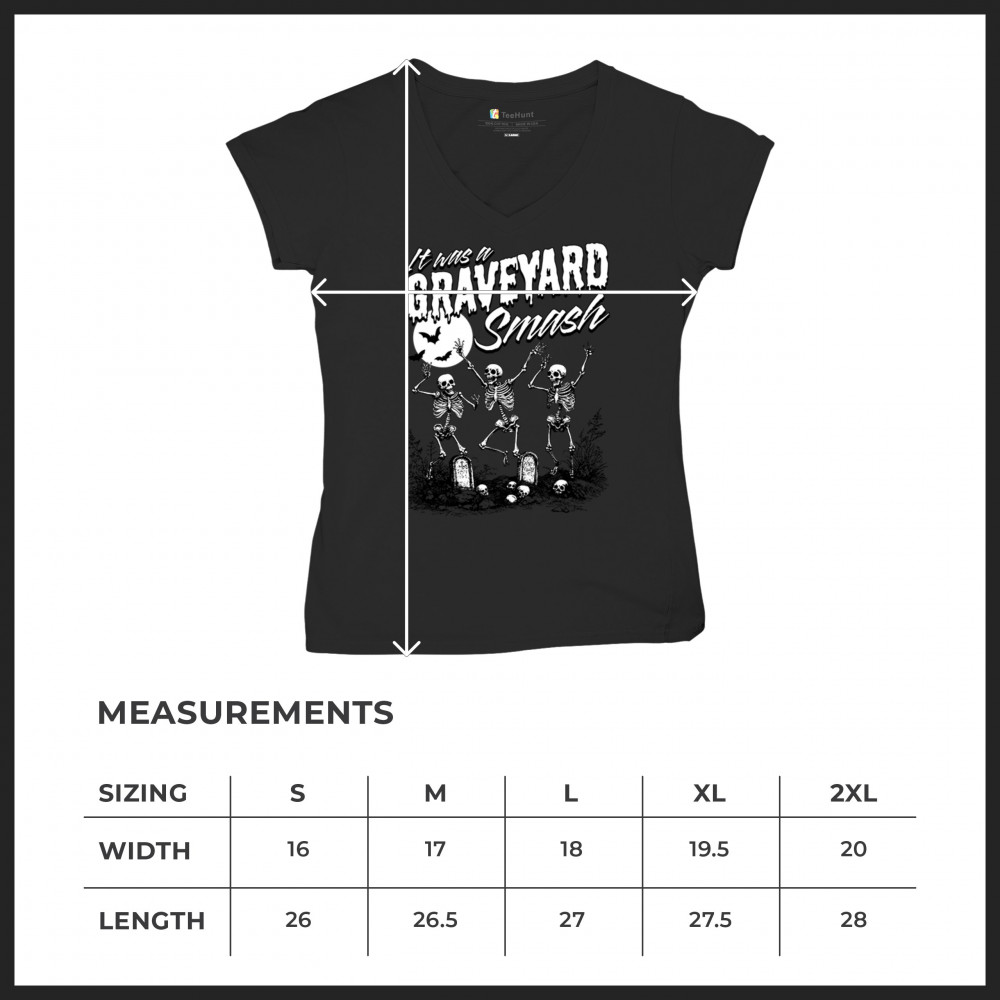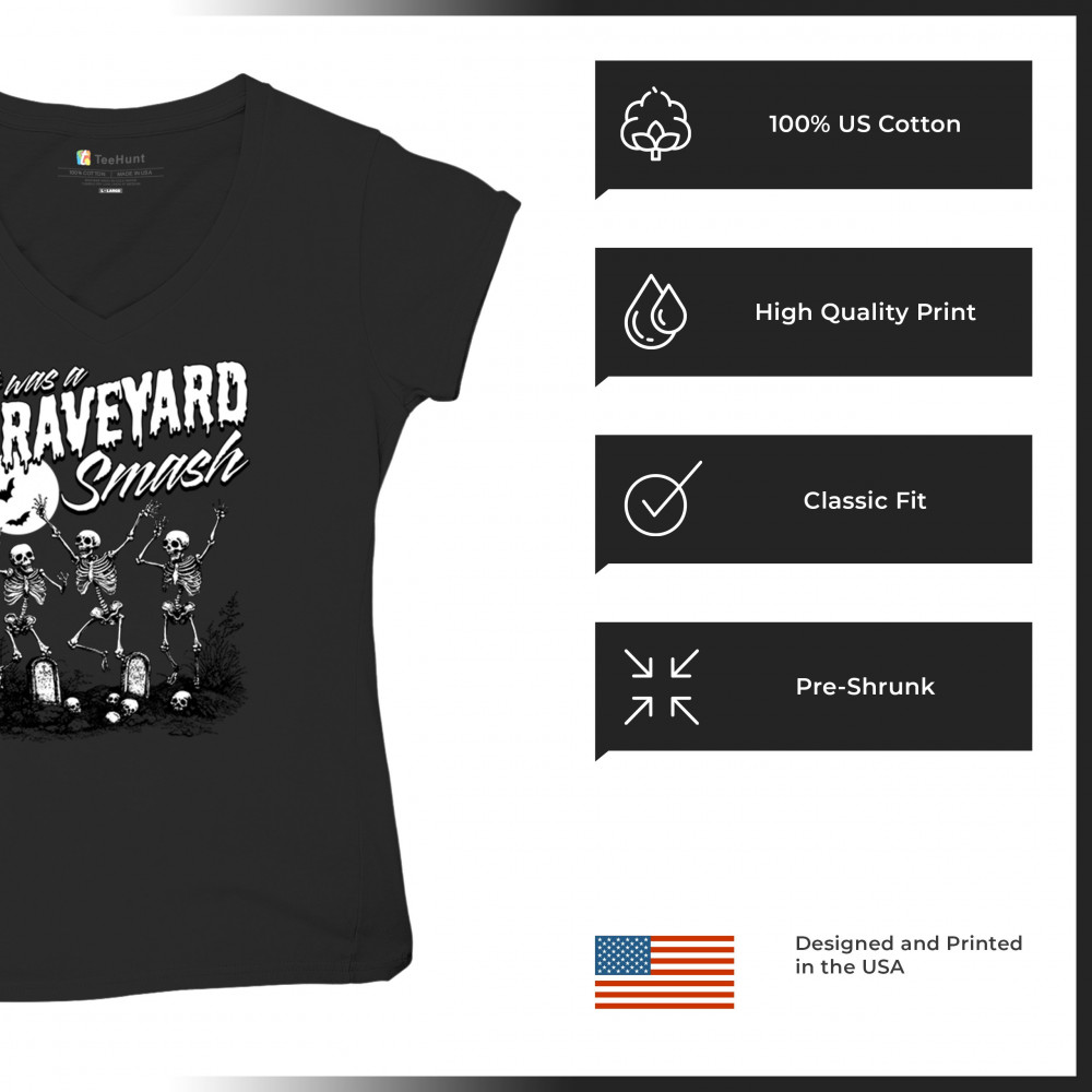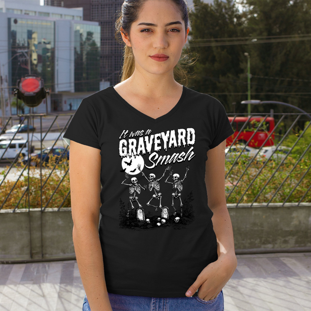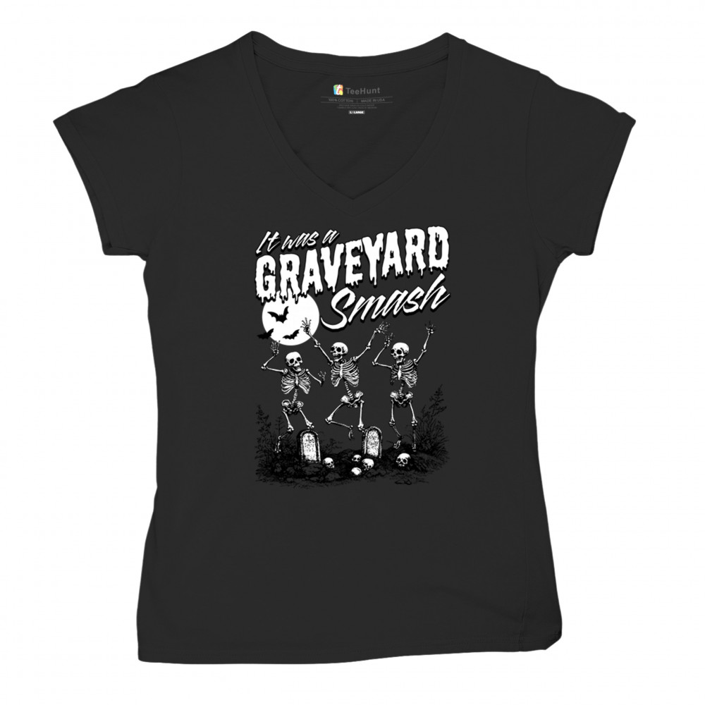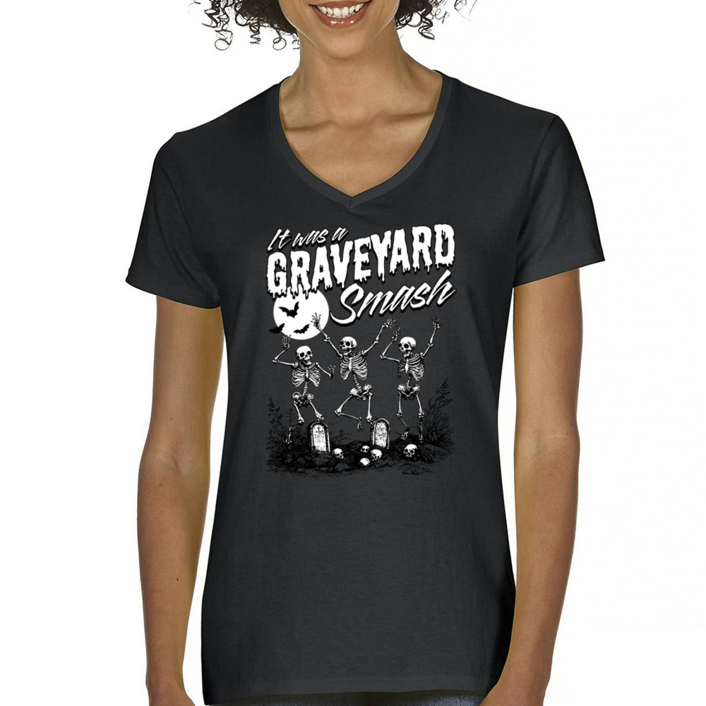 IT WAS A GRAVEYARD SMASH HALLOWEEN SKELETON women's v-neck t-shirt pumpkin tee black