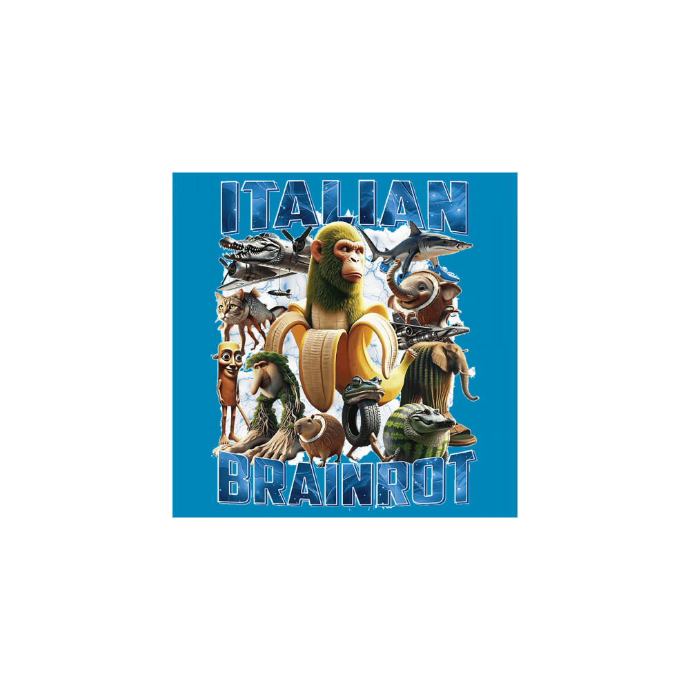 This design captures the full force of Italian brainrot—bananas, sharks, monkeys, and meme beasts collide in an unfiltered internet-core explosion. Perfect for fans of cursed humor, Gen Z trends, absurd fashion, TikTok memes, ironic style, surreal pop art, chaotic culture, digital nonsense, Gen Alpha brainrot, and hyper-online energy.