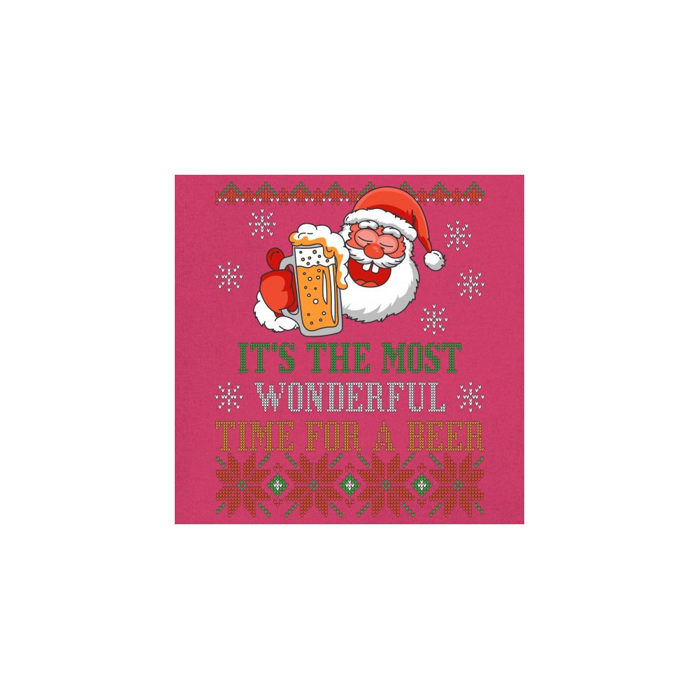 A print saying: "It's the Most Wonderful Time for a Beer" and featuring Santa Claus holding a glass of beer. The print is designed as an ugly sweater. Amazing choice for a single person who wants to make people smile and spread positive vibes on Christmas