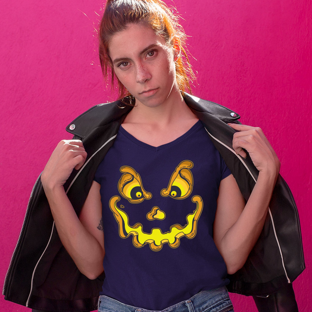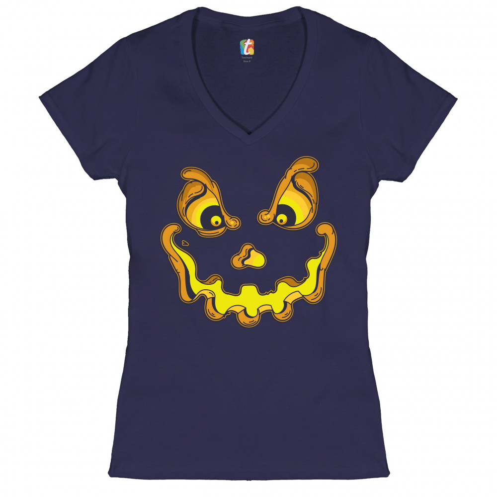 JACK-O-LANTERN PUMPKIN FACE jack-o-lantern pumpkin women's v-neck t-shirt trick-or-treat halloween tee navy blue
