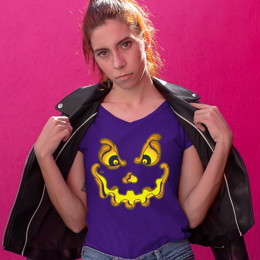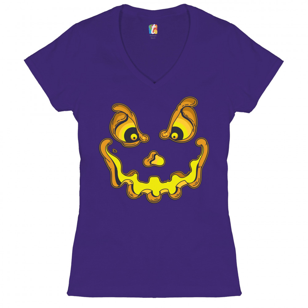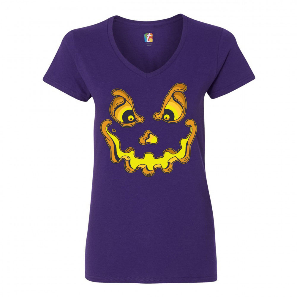 JACK-O-LANTERN PUMPKIN FACE jack-o-lantern pumpkin women's v-neck t-shirt trick-or-treat halloween tee purple