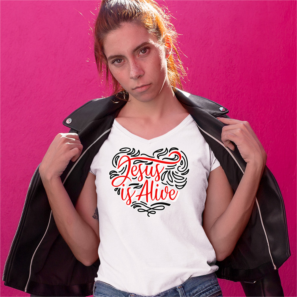 A print featuring a heart and the words "Jesus is alive" written above it. A great choice to wear on Easter to show your passion for Jesus Christ.