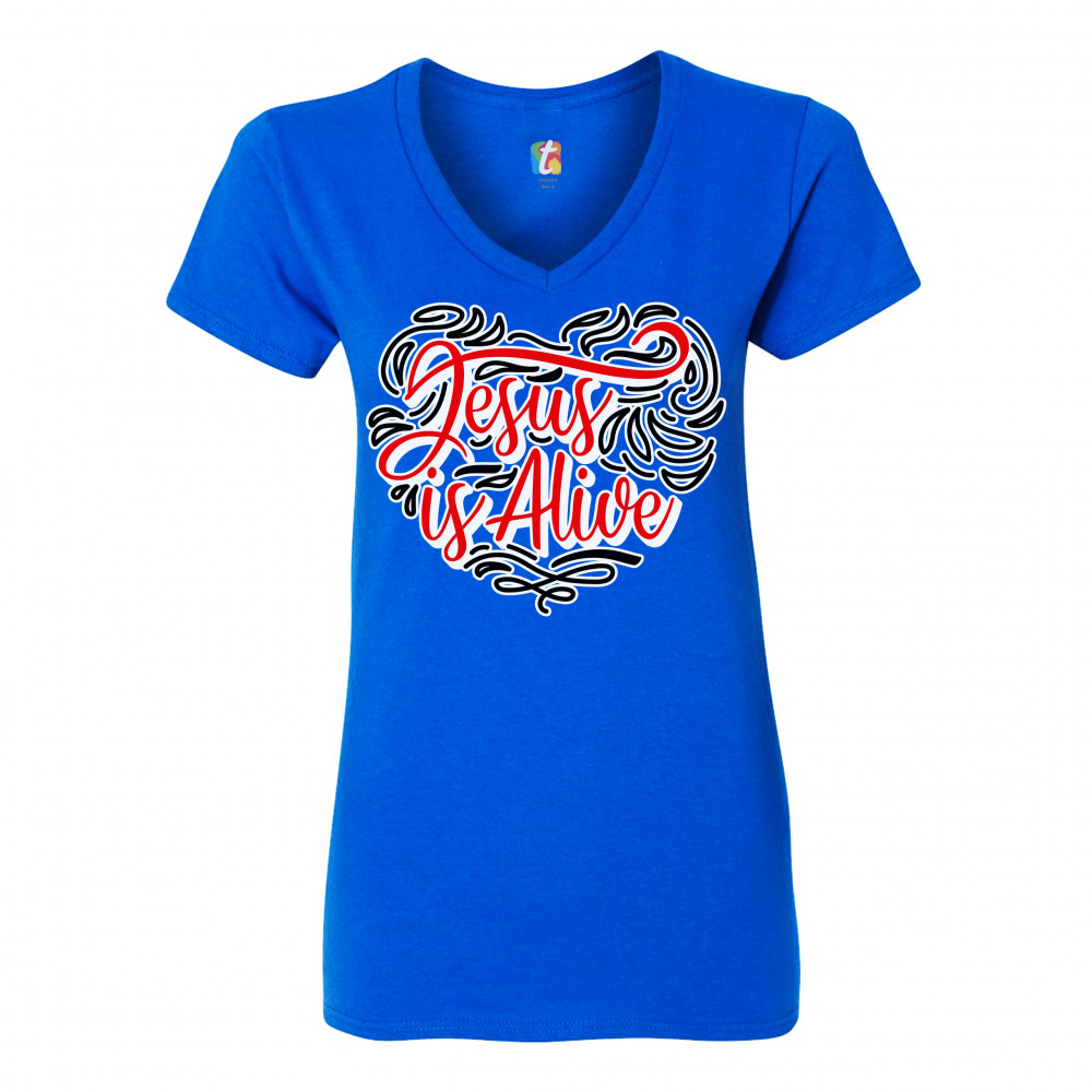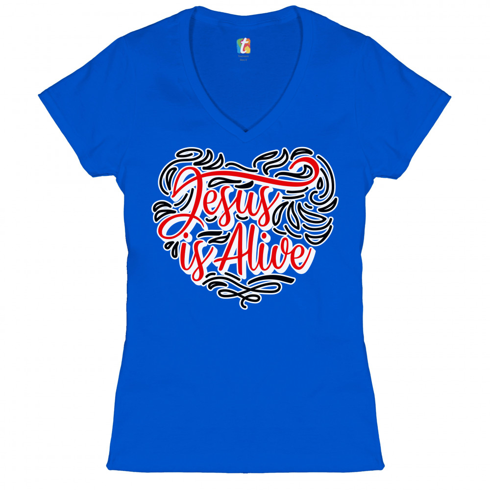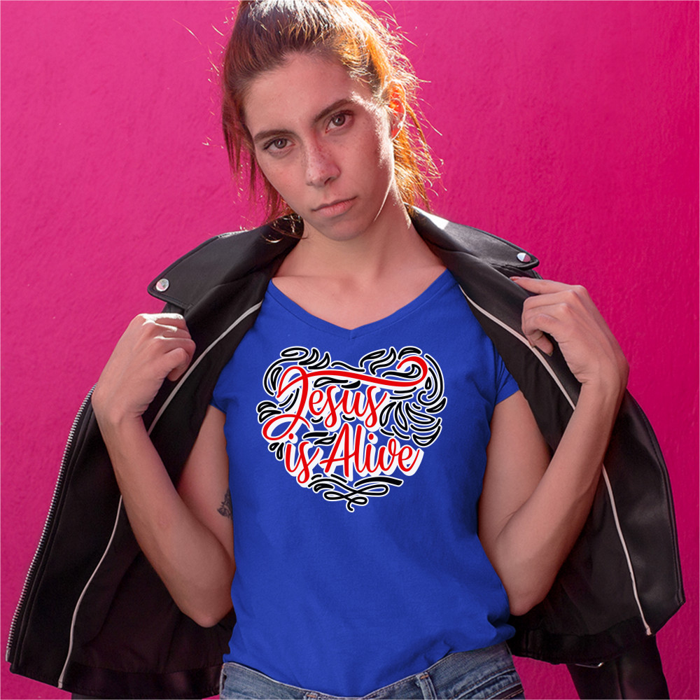 JESUS IS ALIVE women's v-neck t-shirt happy easter bible jesus christ has risen tee royal blue