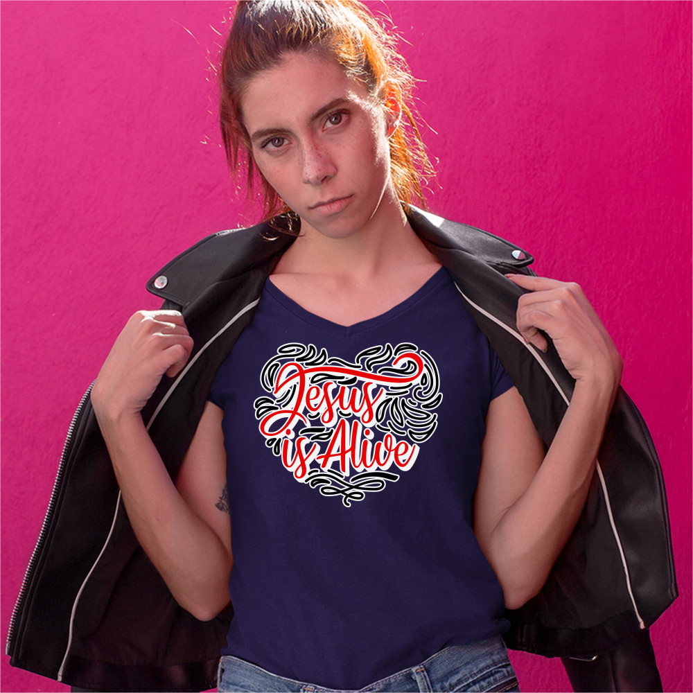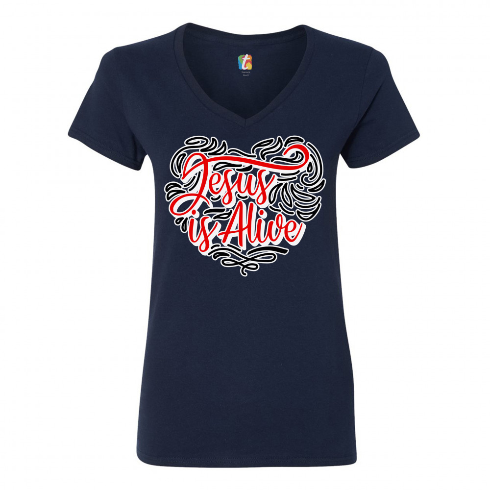 JESUS IS ALIVE women's v-neck t-shirt happy easter bible jesus christ has risen tee navy blue