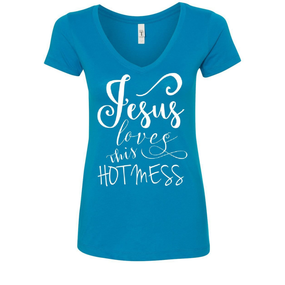 JESUS LOVES THIS HOT MESS women's v-neck t-shirt funny religious christian lord turquoise