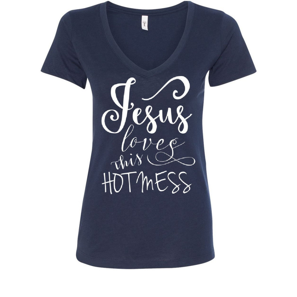 JESUS LOVES THIS HOT MESS women's v-neck t-shirt funny religious christian lord navy blue