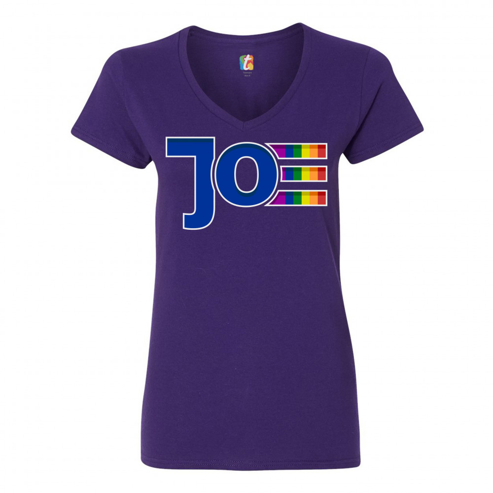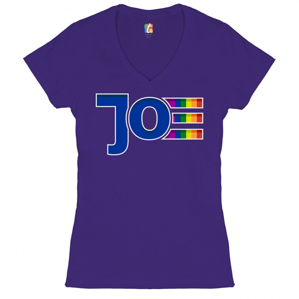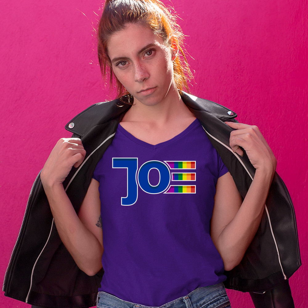 A political print featuring the name of the democratic presidential candidate "Joe". The letter "e" is painted with the colors of the lgbt rainbow. It is a great choice to wear to show your support for the democratic presidential nominee and his vice pres