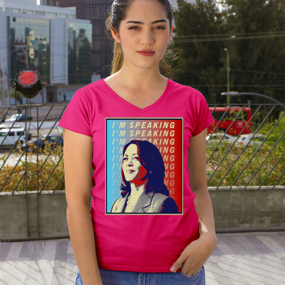 Support Kamala Harris with this bold and inspiring design. "I'M SPEAKING" echoes her powerful voice in the political arena, making it perfect for anti-Trump supporters, liberals, and Democrats. Crafted from durable materials, this design is comfortable for any event, from rallies to casual outings. Celebrate diversity and the historic candidacy of the potential first female president, resonating with black Americans, Hispanic Americans, LGBTQ supporters, and other minorities. Make a statement of hope and progress with this unique design.