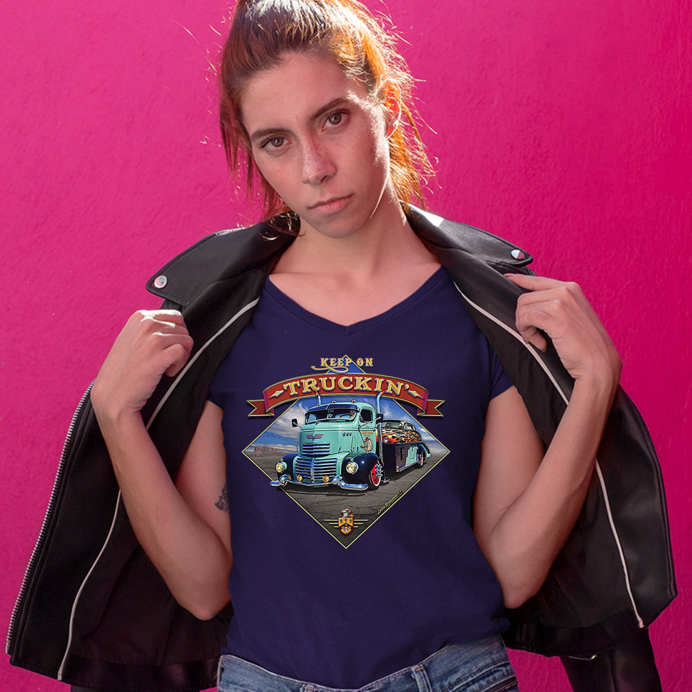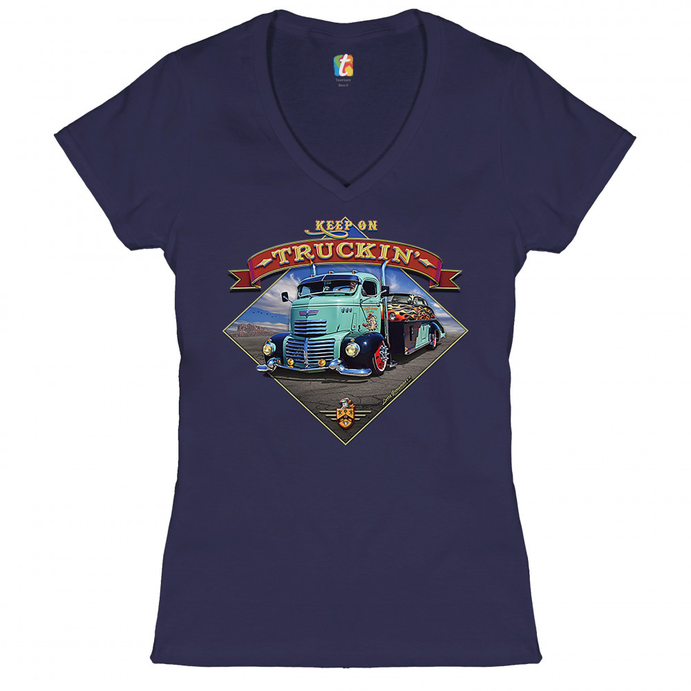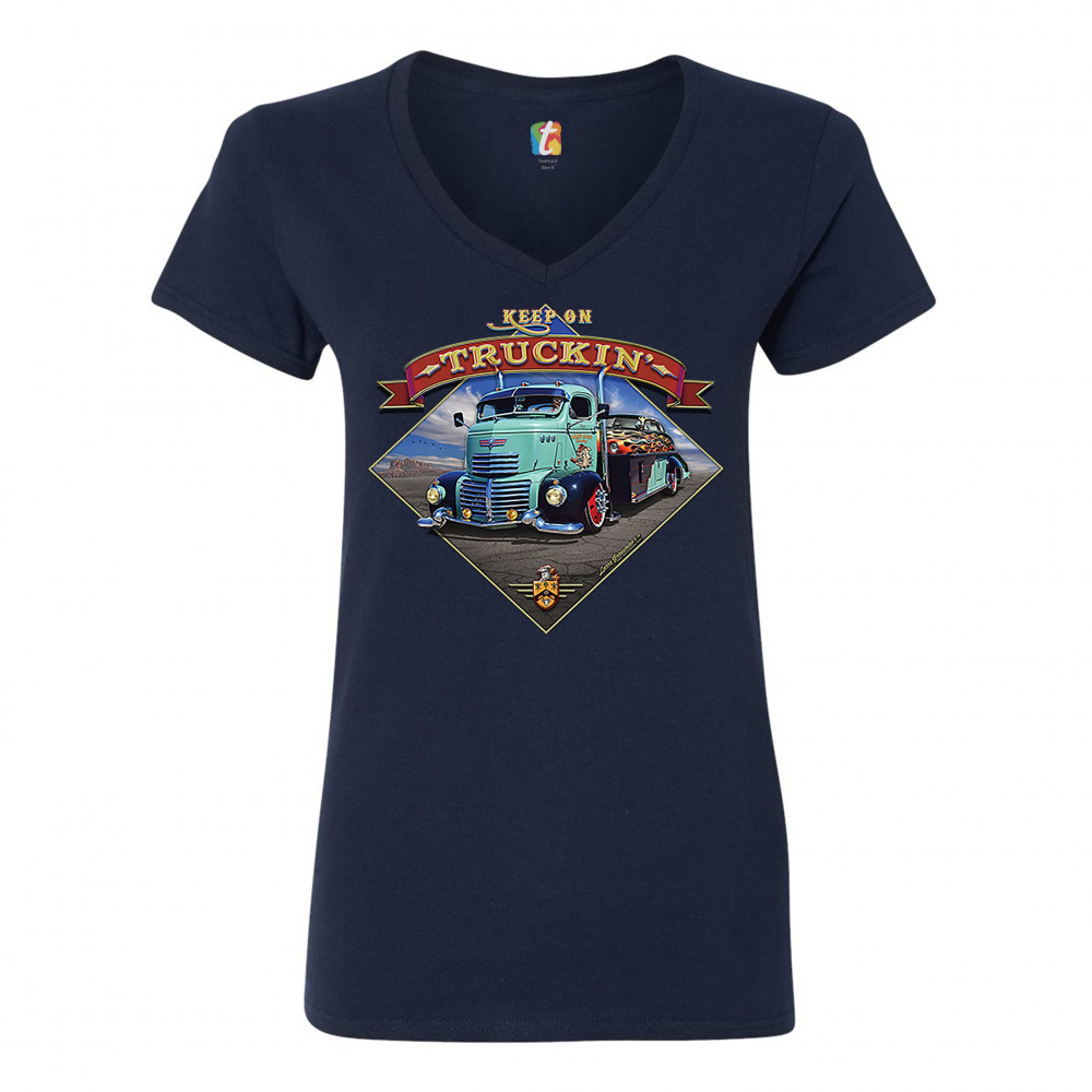 KEEP ON TRUCKIN' keep on truckin women's v-neck t-shirt route 66 retro vintage truck driver tee navy blue