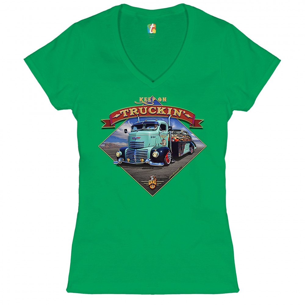 KEEP ON TRUCKIN' keep on truckin women's v-neck t-shirt route 66 retro vintage truck driver tee green