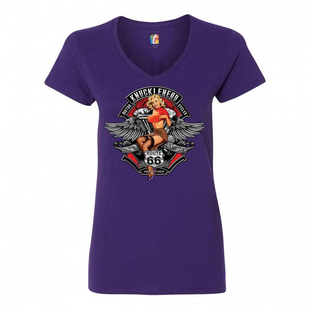 A print featuring a sexy pin-up girl. In front of her legs there is a "Route 66" sign. In the background there is a motorcycle engine and wings behind it. The print says: "Knucklehead motorcycles since 1903. Old time classics. America's finest". A great c