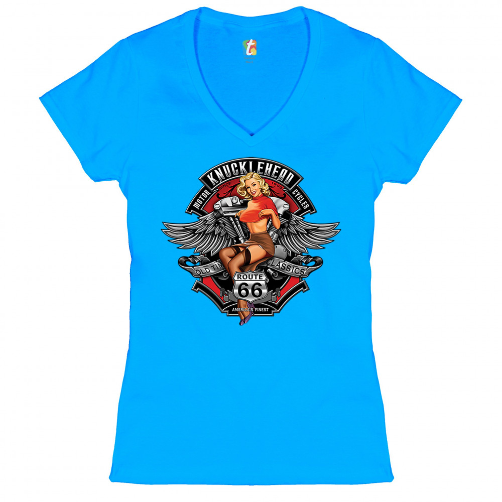 KNUCKLEHEAD MOTORCYCLES women's v-neck t-shirt route 66 pin-up girl biker tee turquoise