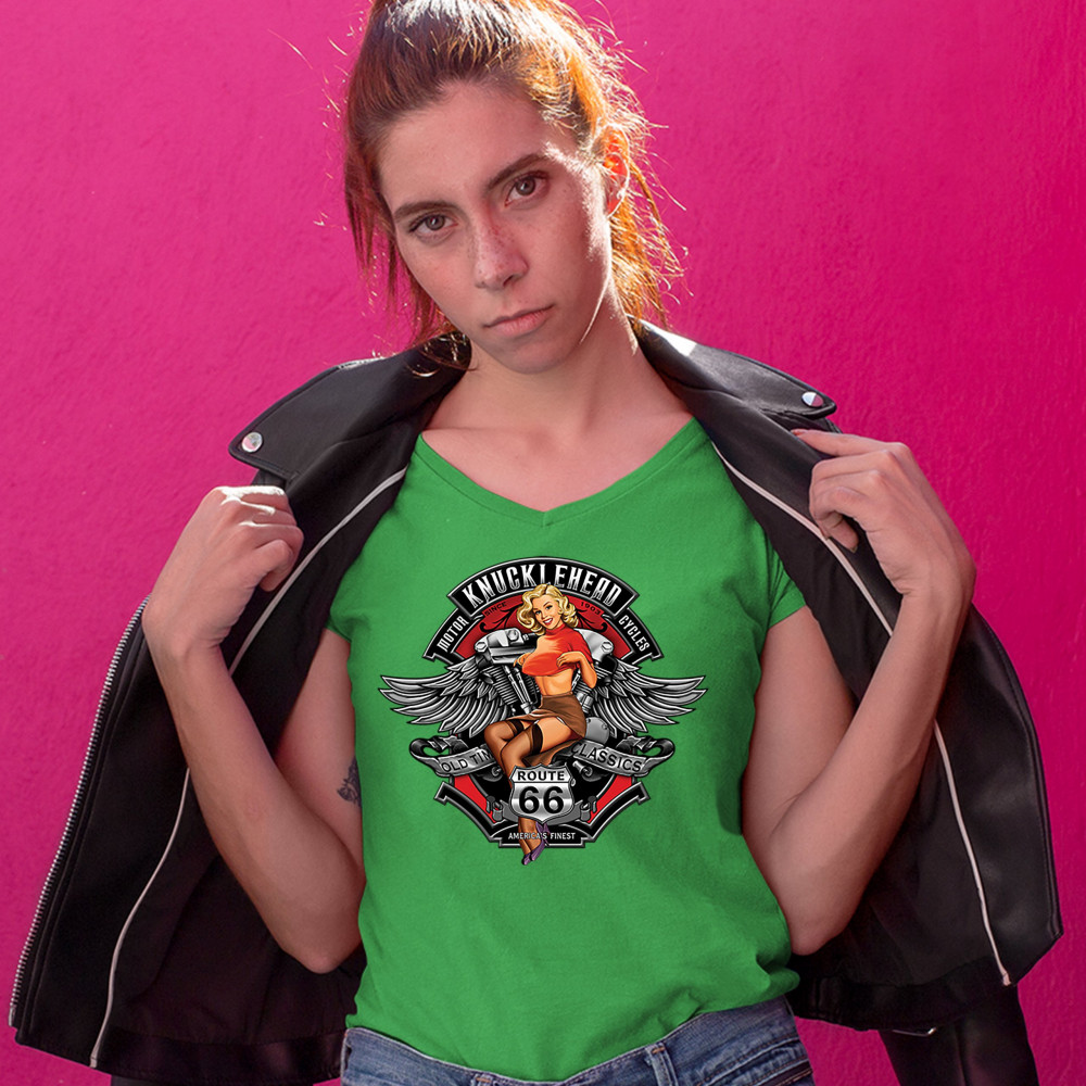 A print featuring a sexy pin-up girl. In front of her legs there is a "Route 66" sign. In the background there is a motorcycle engine and wings behind it. The print says: "Knucklehead motorcycles since 1903. Old time classics. America's finest". A great c