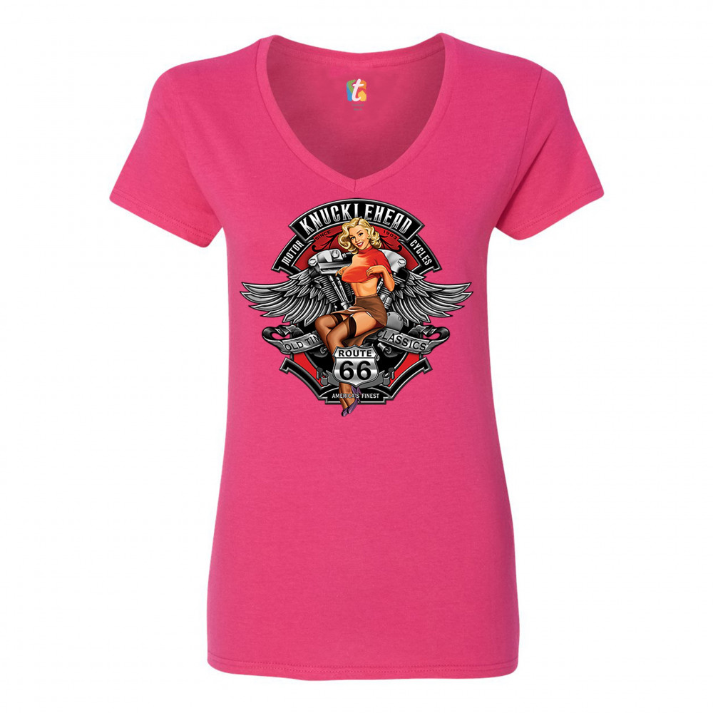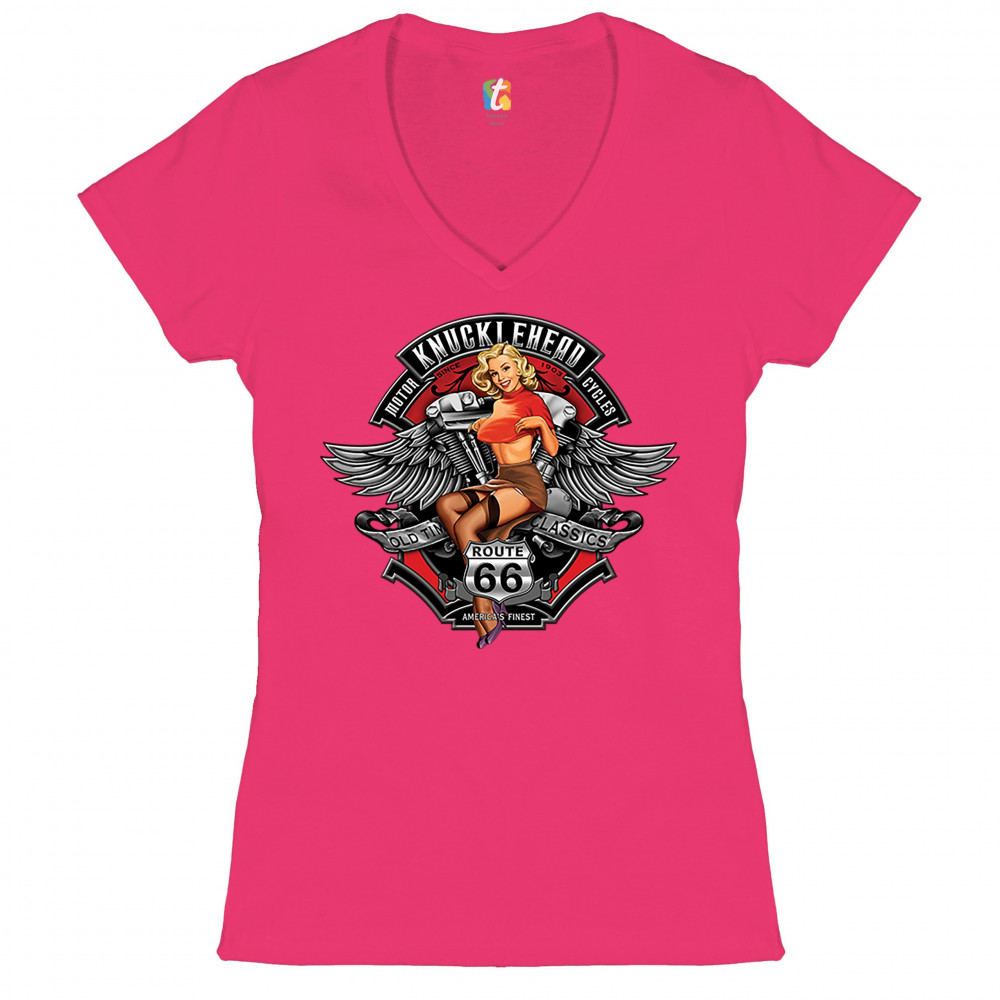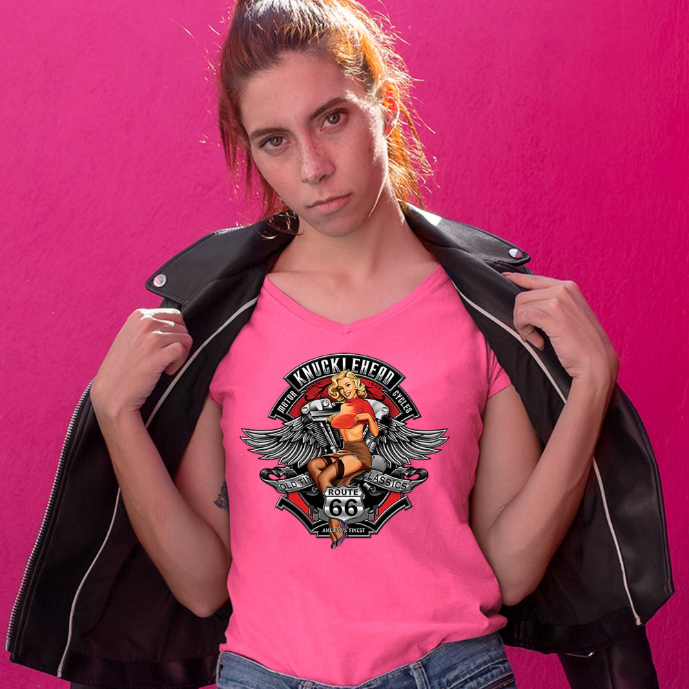 A print featuring a sexy pin-up girl. In front of her legs there is a "Route 66" sign. In the background there is a motorcycle engine and wings behind it. The print says: "Knucklehead motorcycles since 1903. Old time classics. America's finest". A great c