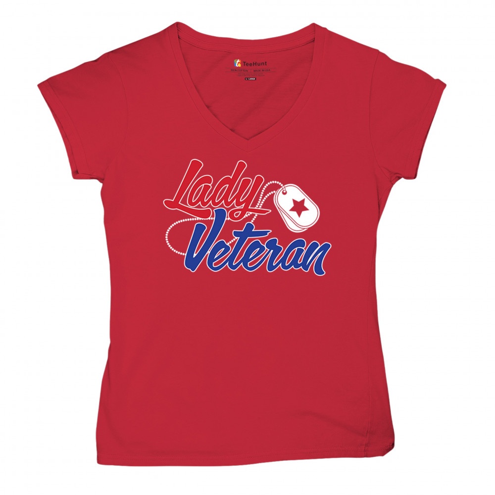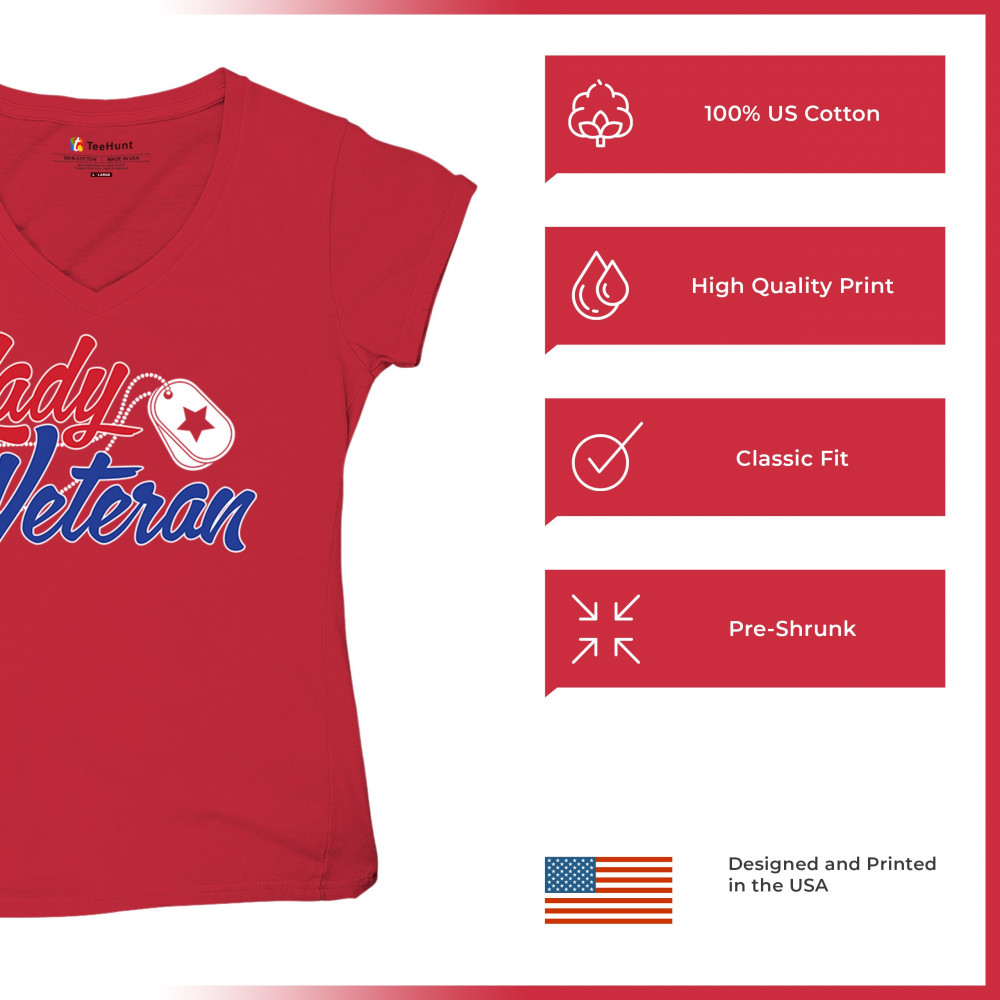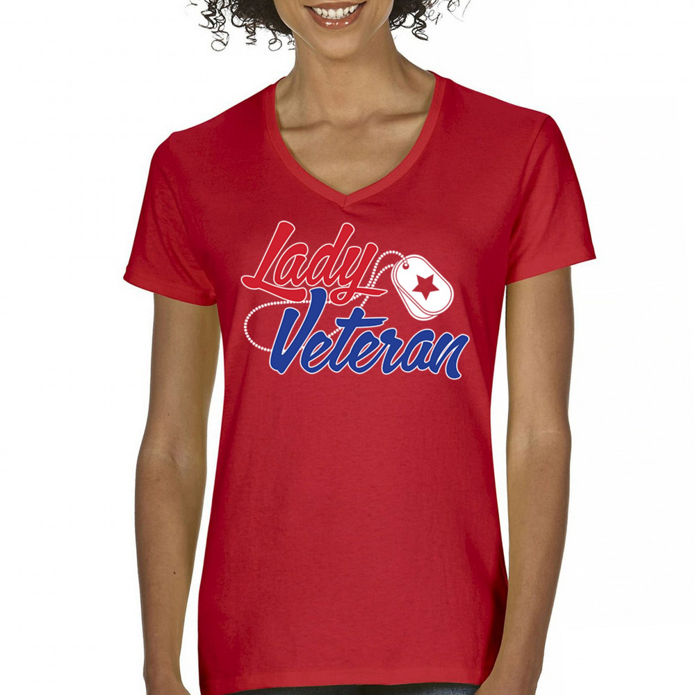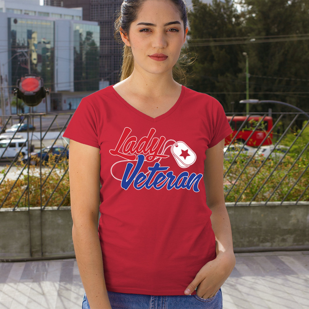 Celebrate female veterans with our "Lady Veteran" shirt. Bold red and blue design, perfect for Veterans Day and everyday wear. Honor and pride in service.