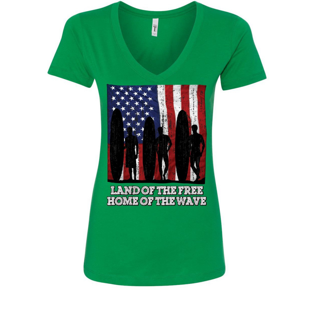 LAND OF THE FREE SURFING v-neck t-shirt home of the wave beach green