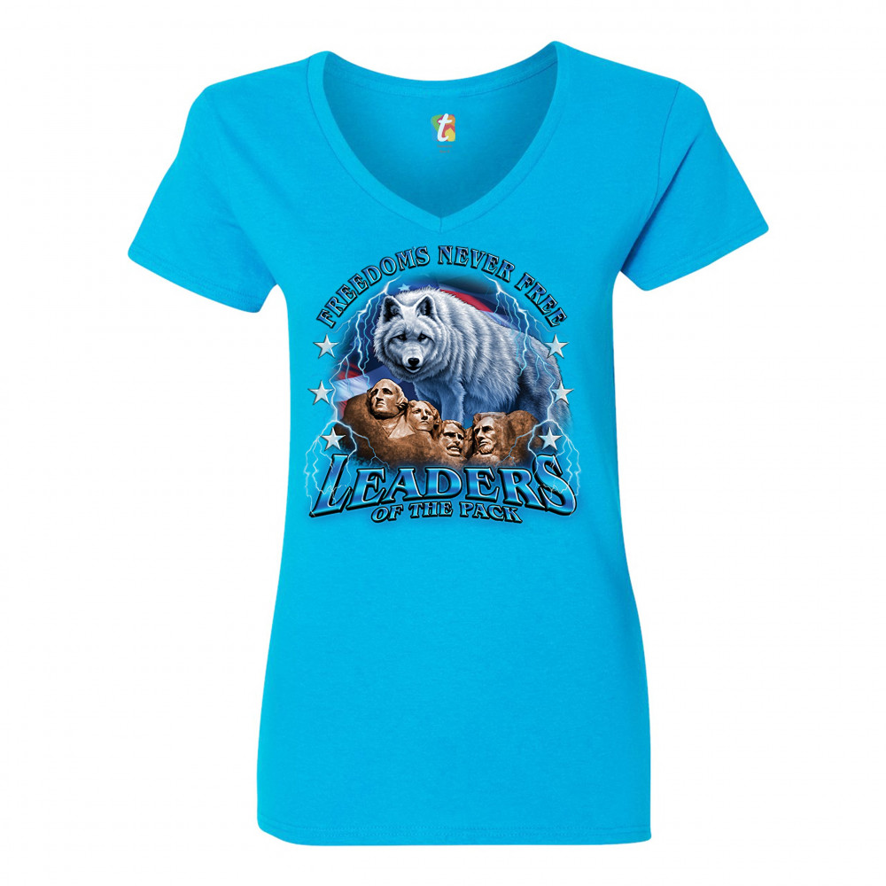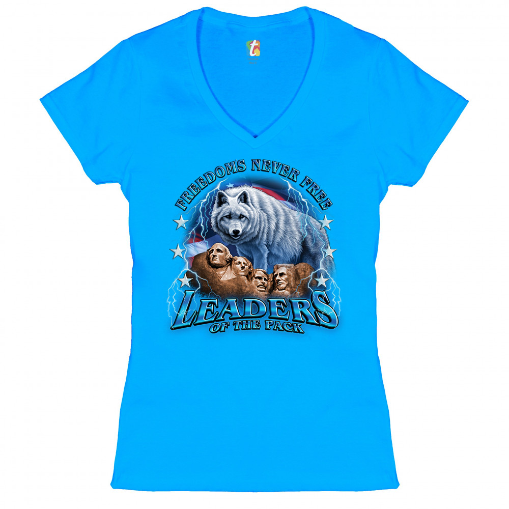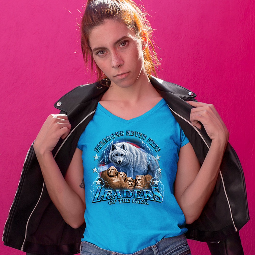 A patriotic print featuring the Mount Rushmore. There is a huge white wolf with the American flag in the background and lightning strikes all over the place. The print says: "Freedom's Never Free, Leaders of the Pack". Great choice to wear on Independence
