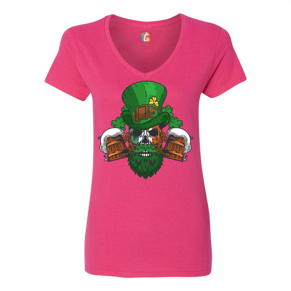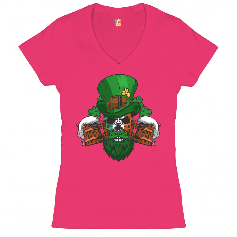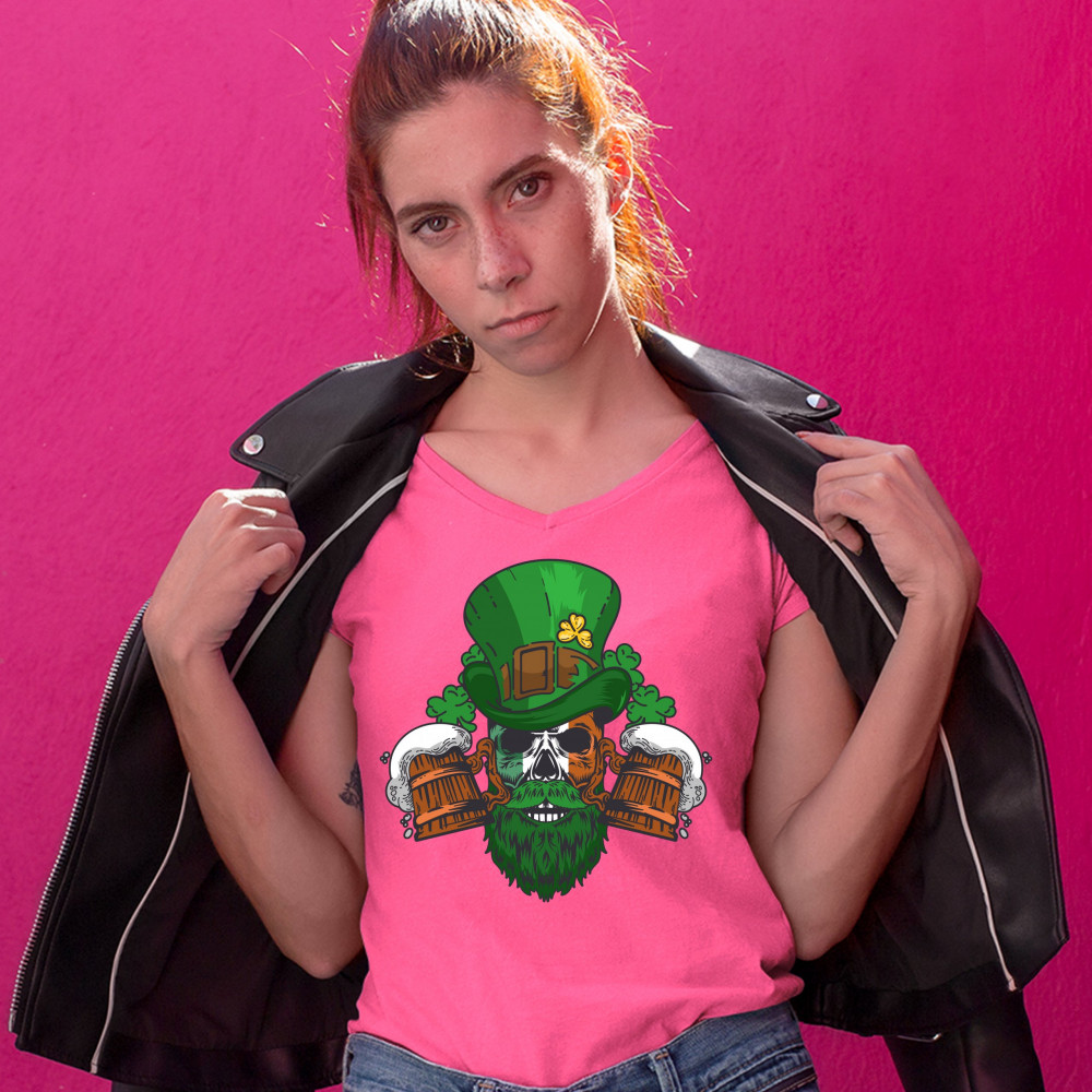 A print featuring a skull with green beard and Irish flag face. The skull is wearing a leprechaun hat. There are two beer mugs and numerous shamrocks around the skull. A great choice to wear on March 17 to celebrate the St. Patrick's Day and showcase your