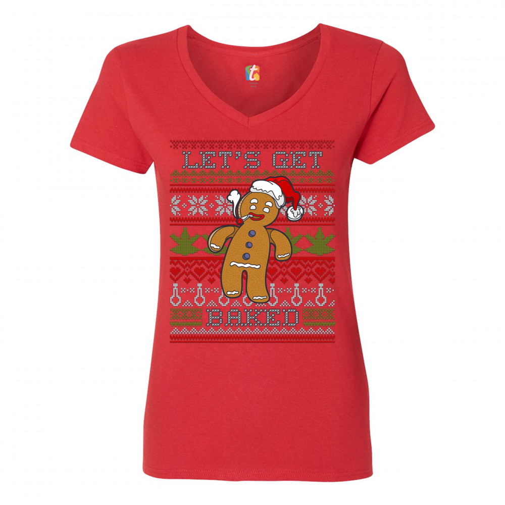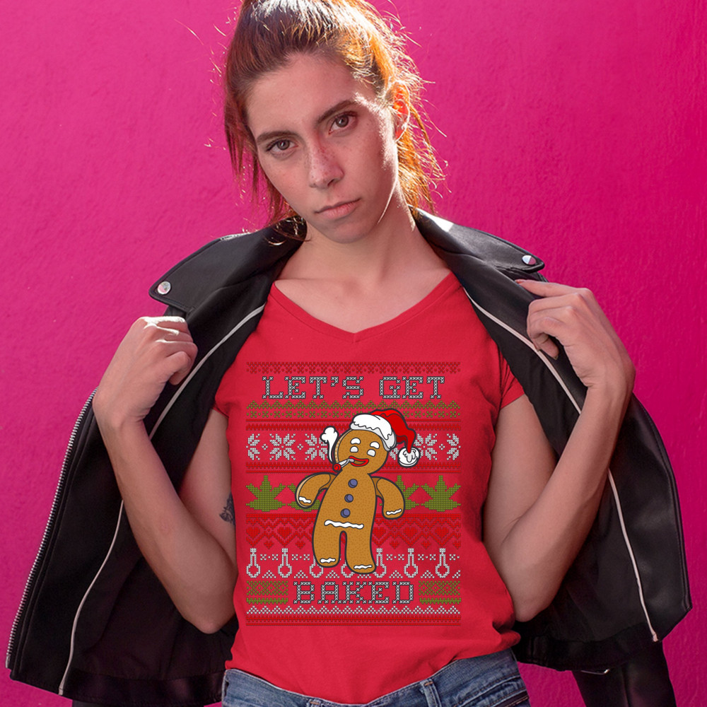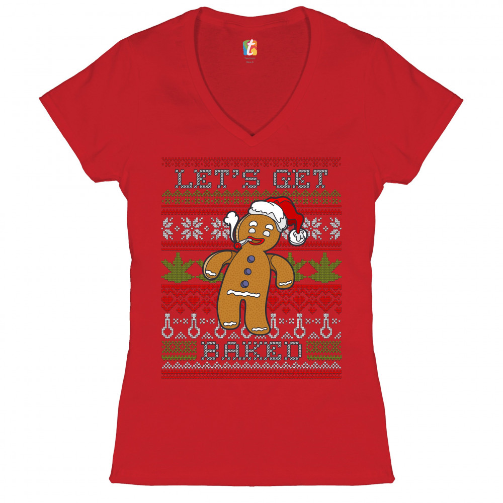 LET'S GET BAKED women's v-neck t-shirt ugly sweater gingerbread man 420 tee red