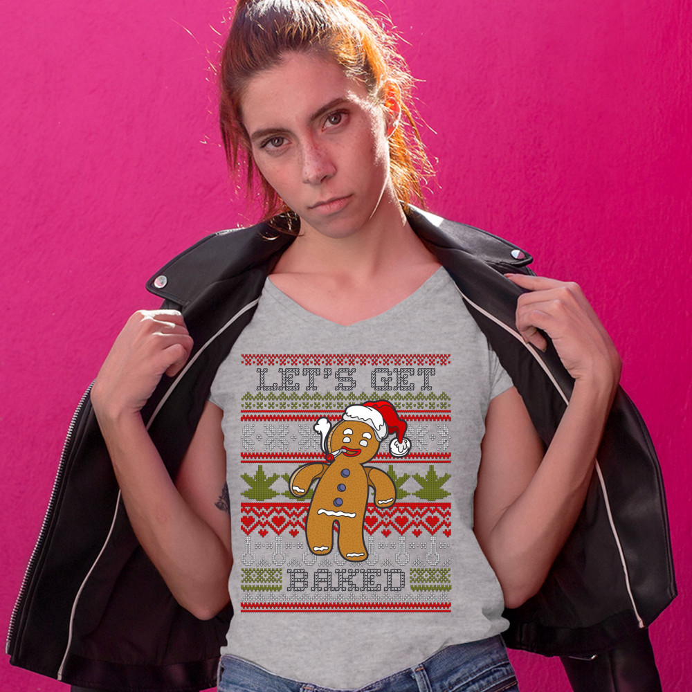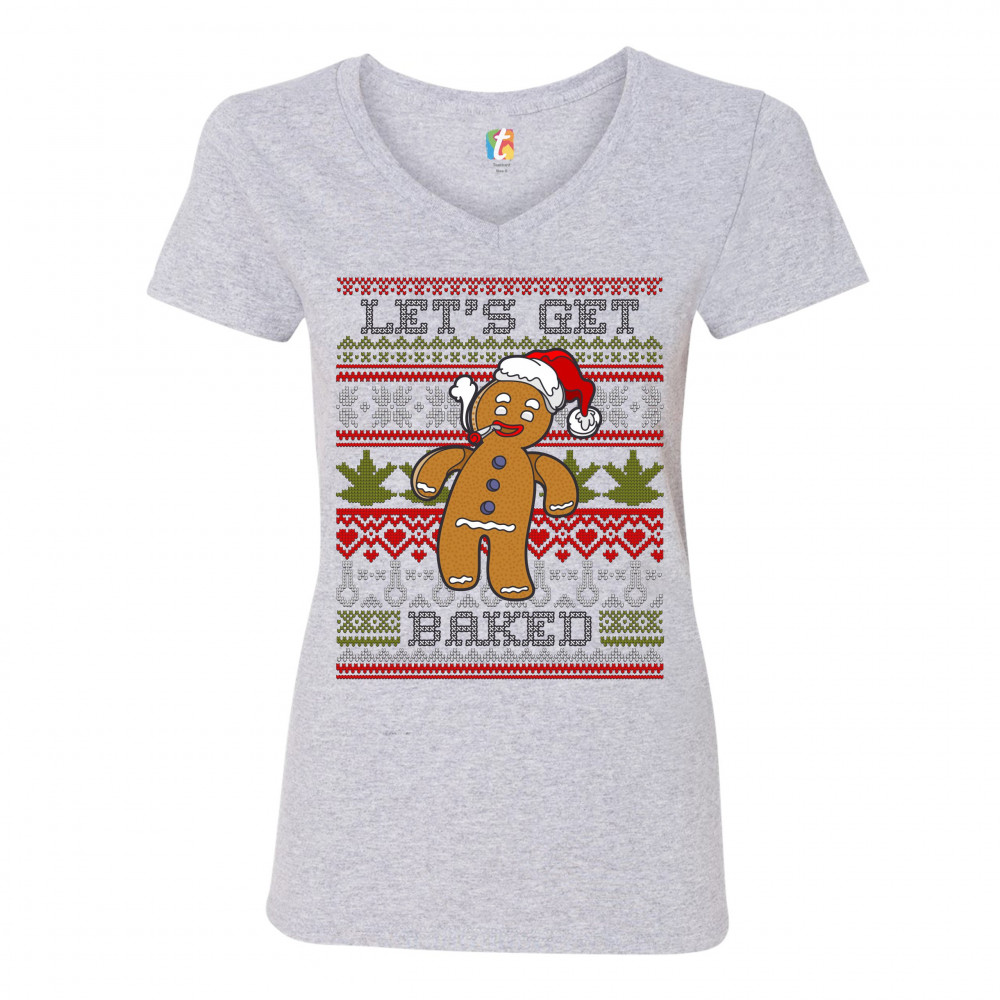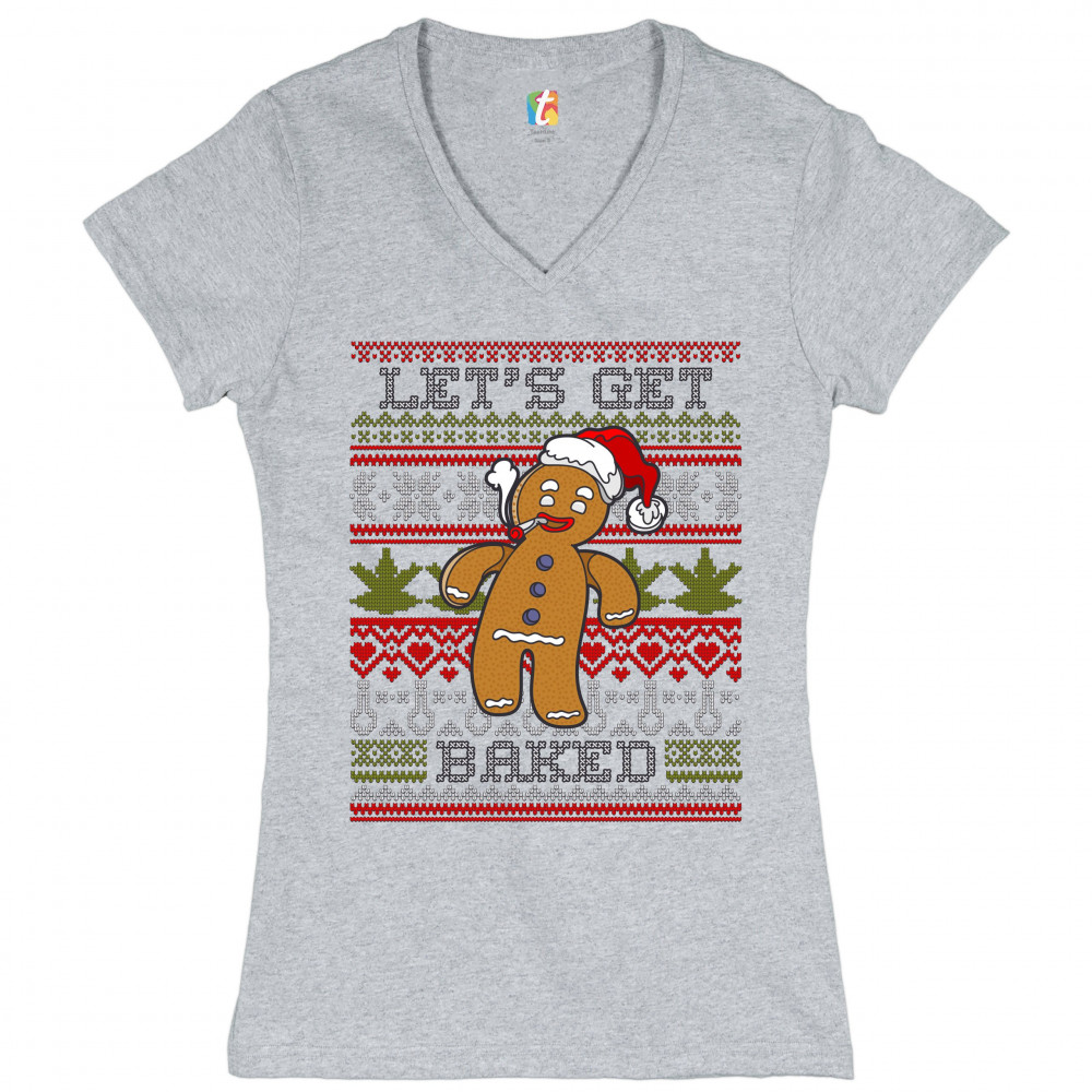LET'S GET BAKED women's v-neck t-shirt ugly sweater gingerbread man 420 tee gray